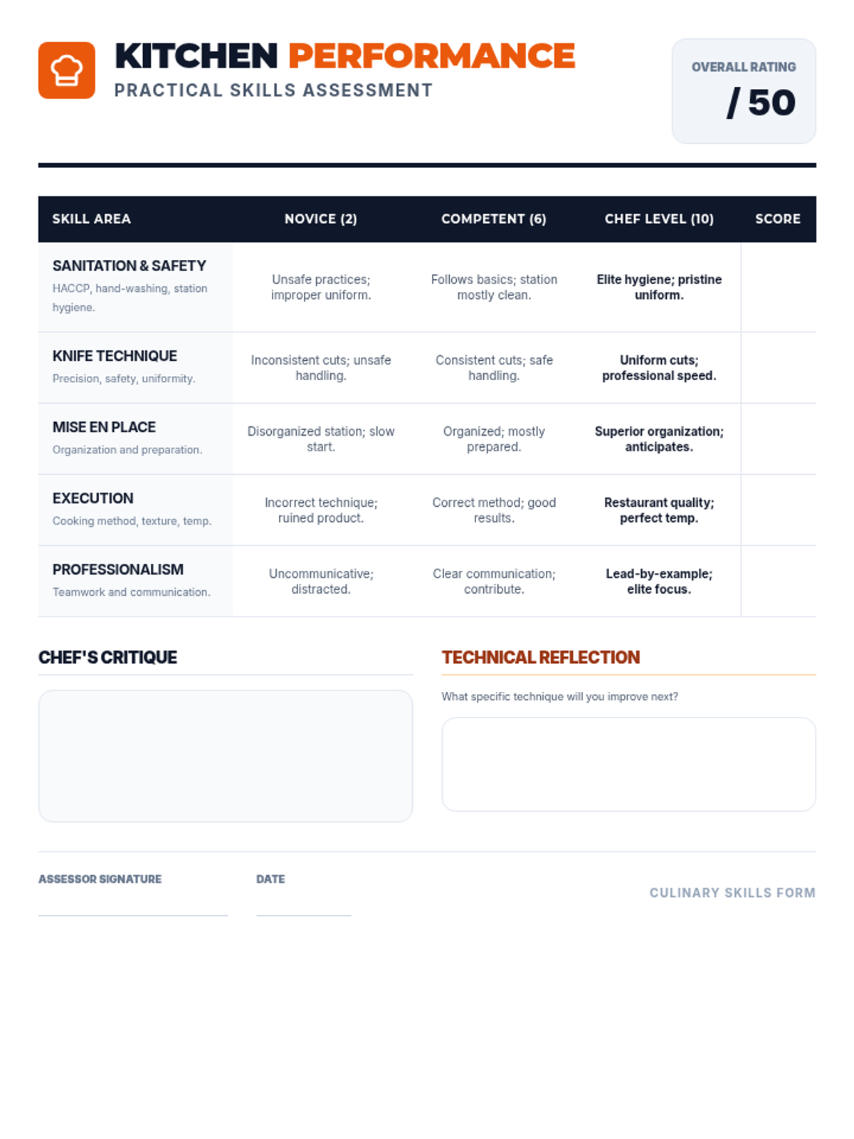 A practical culinary skills assessment tool for instructors to evaluate students on sanitation, knife skills, Mise en Place, technical execution, and professionalism in the kitchen.