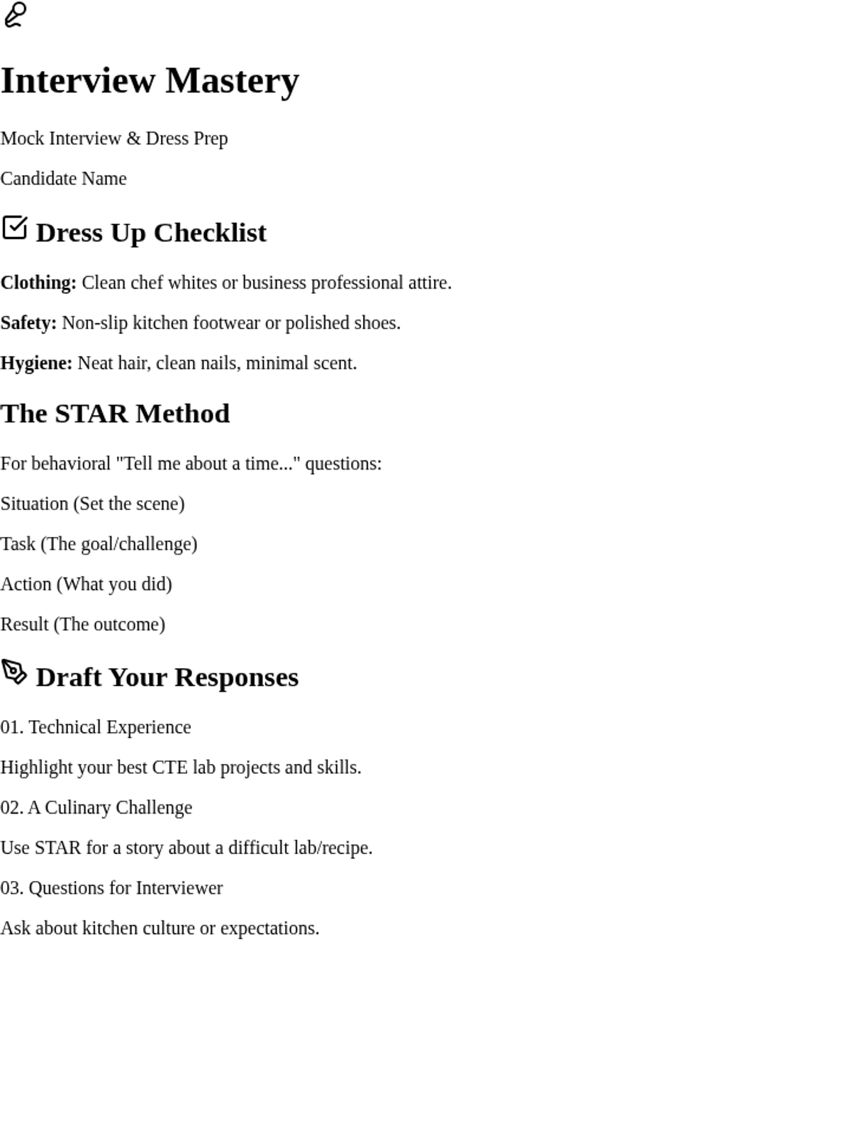 An interview preparation guide for students, featuring a Dress Up Day checklist, an explanation of the STAR method, and practice prompts for common interview questions.