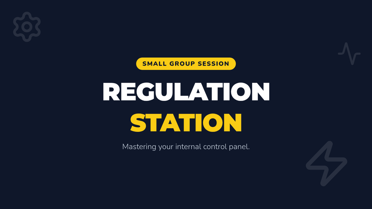 A visual slide deck for a small group counseling session on self-regulation, using a high-energy 'Regulation Station' theme to help students identify their emotional states, triggers, and coping tools.