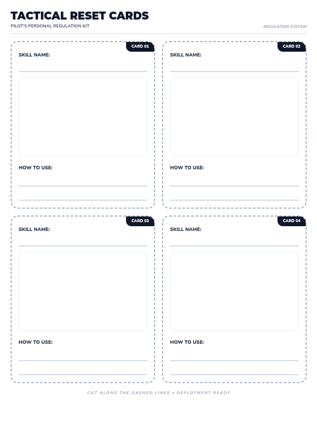 A set of customizable 'Tactical Reset Cards' where students can draw and describe the coping skills they've learned to create their own portable regulation kit.
