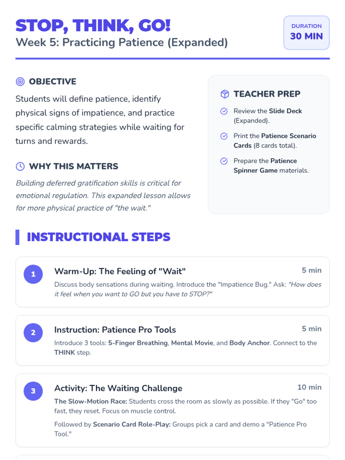 Expanded lesson plan for a 30-minute session on patience, including new instructional steps and a physical activity.