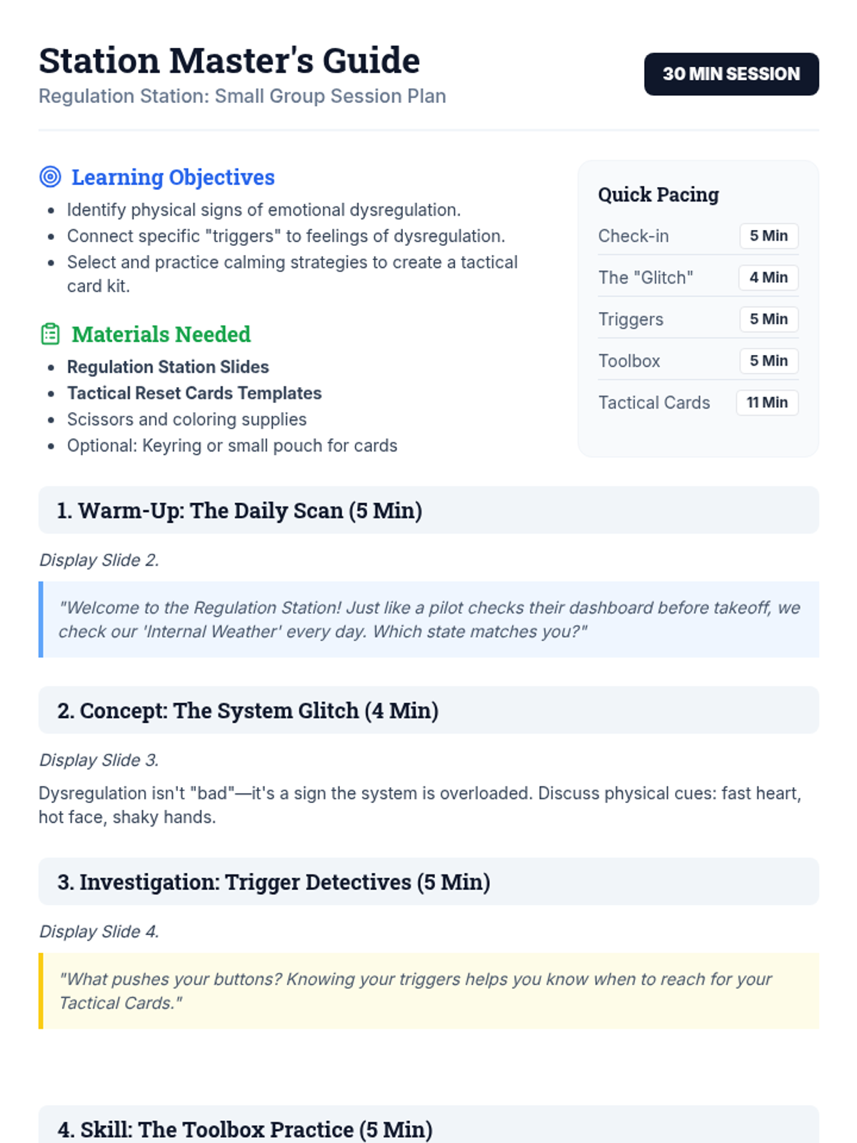 A comprehensive facilitation guide for counselors leading the 30-minute 'Regulation Station' small group session. Includes pacing, scripts, learning objectives, and troubleshooting tips.