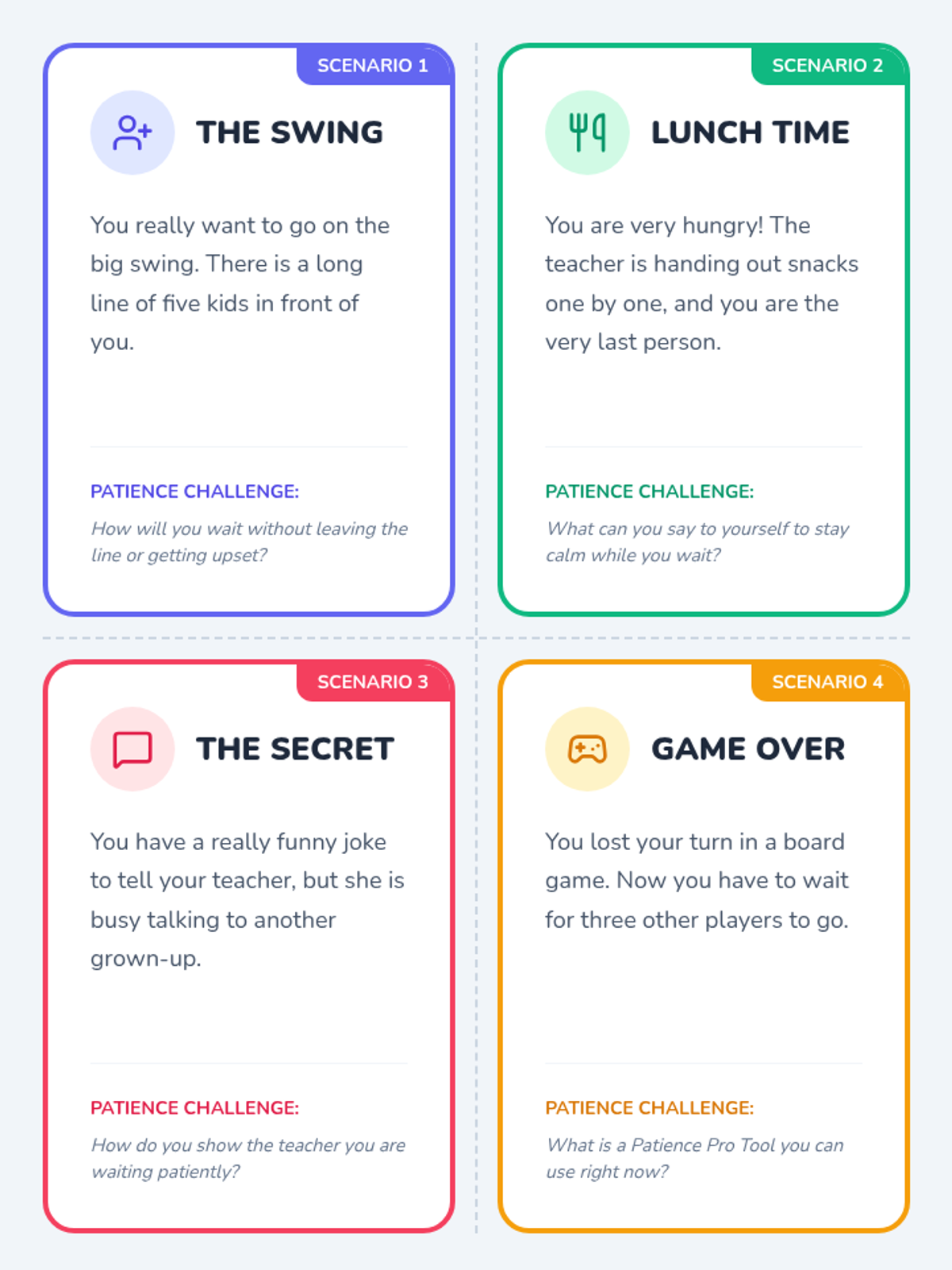 Role-play scenario cards for practicing patience in common classroom and playground situations.