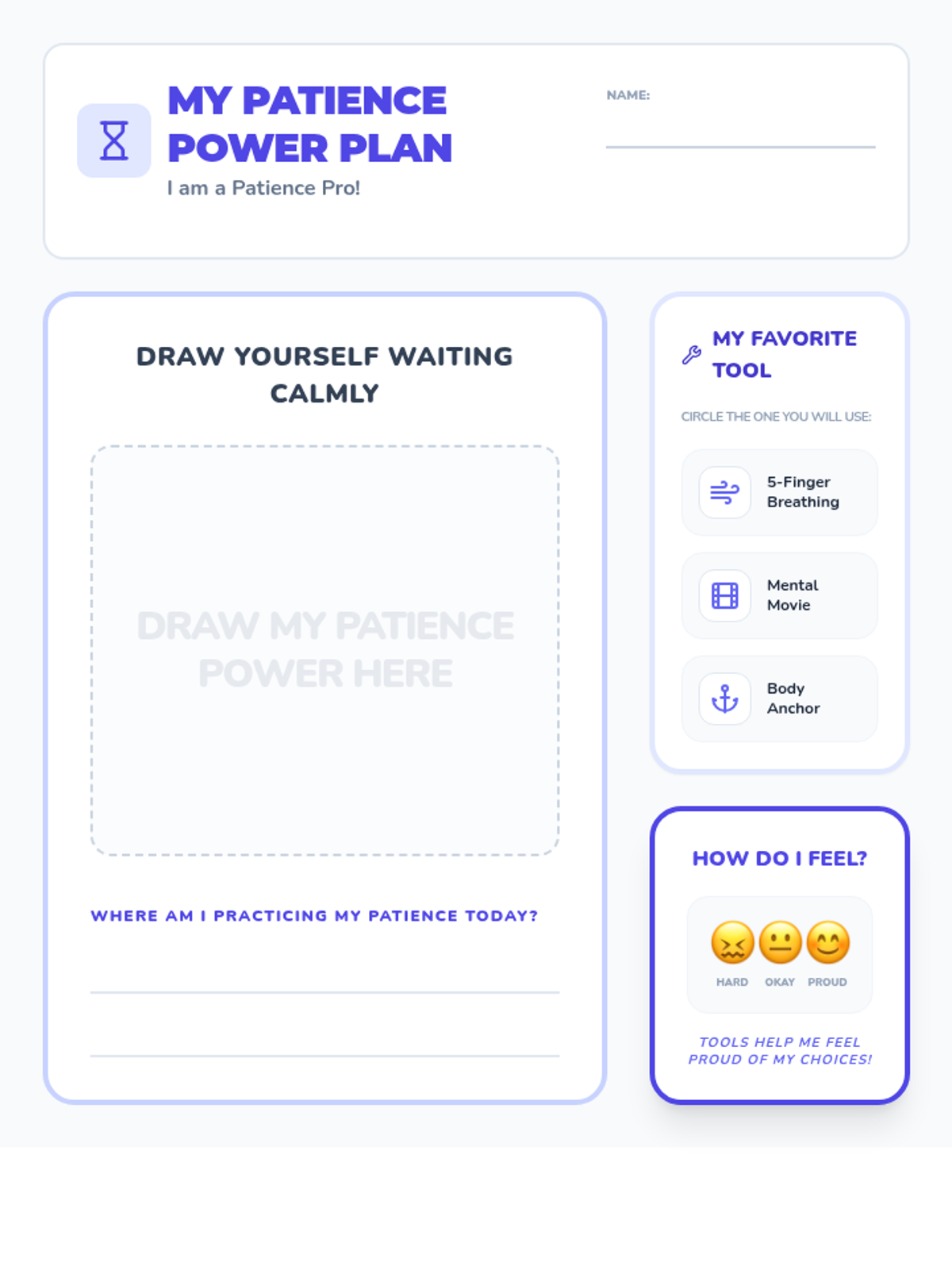 Expanded reflection worksheet for students to plan their patience strategies and identify their favorite 'Patience Pro' tool.