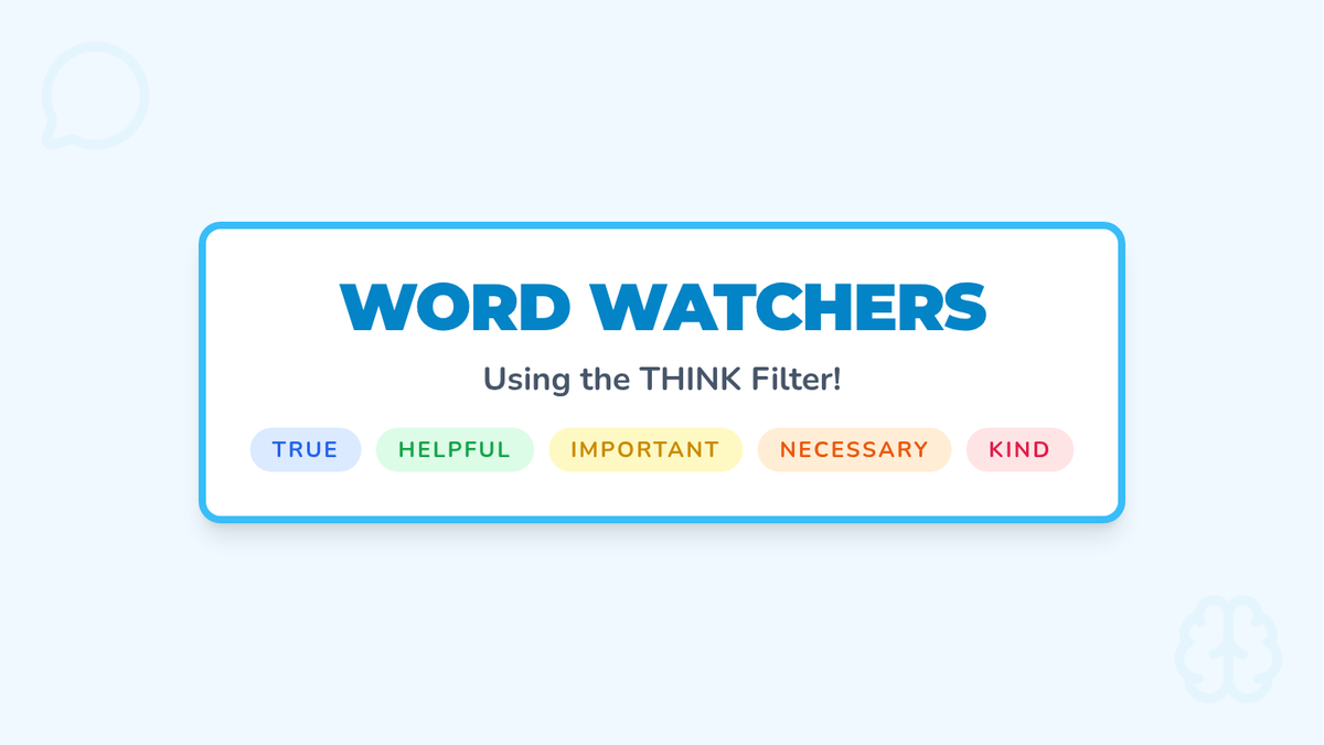 A colorful and interactive slide deck teaching students how to use the THINK filter for their words. Includes definitions for each letter and practice scenarios for class discussion.