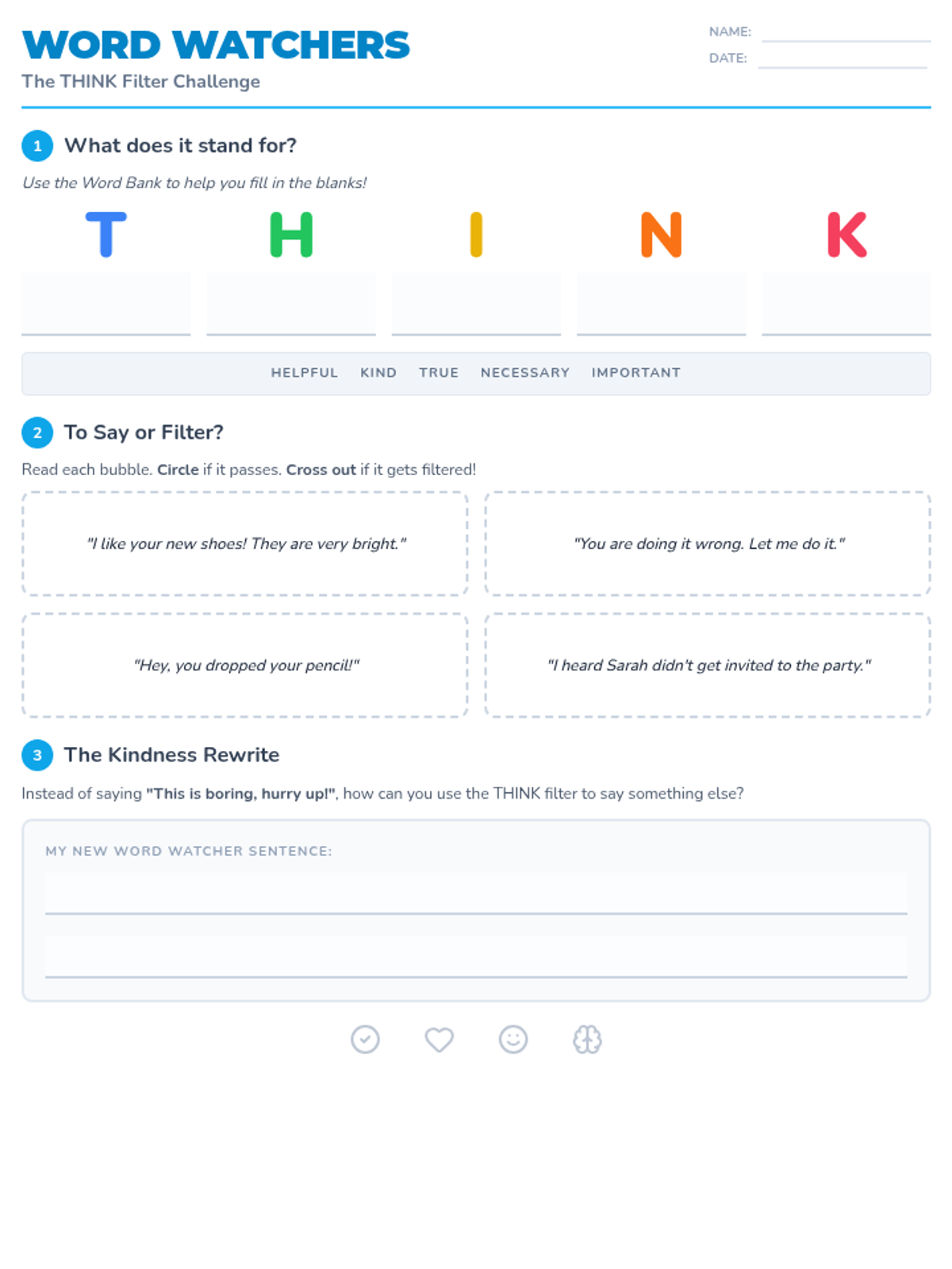 A worksheet for students to practice the THINK acronym. It includes a recall section, a scenario sorting activity, a word bank, and a creative rewriting task.
