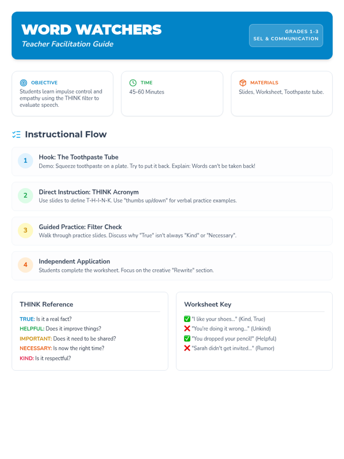 A teacher's guide for facilitating the Word Watchers THINK lesson, including a "Hook" activity, instructional flow, and answer keys.