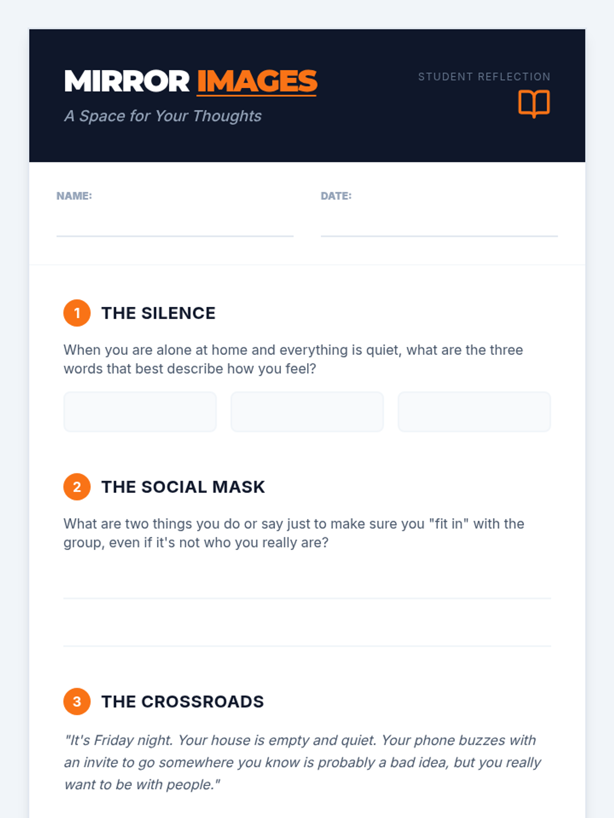 A personal reflection worksheet designed for a 9th-grade student to process their emotions privately. Includes prompts on identifying unmet needs, the 'social mask', and choosing self-worth over social pressure.
