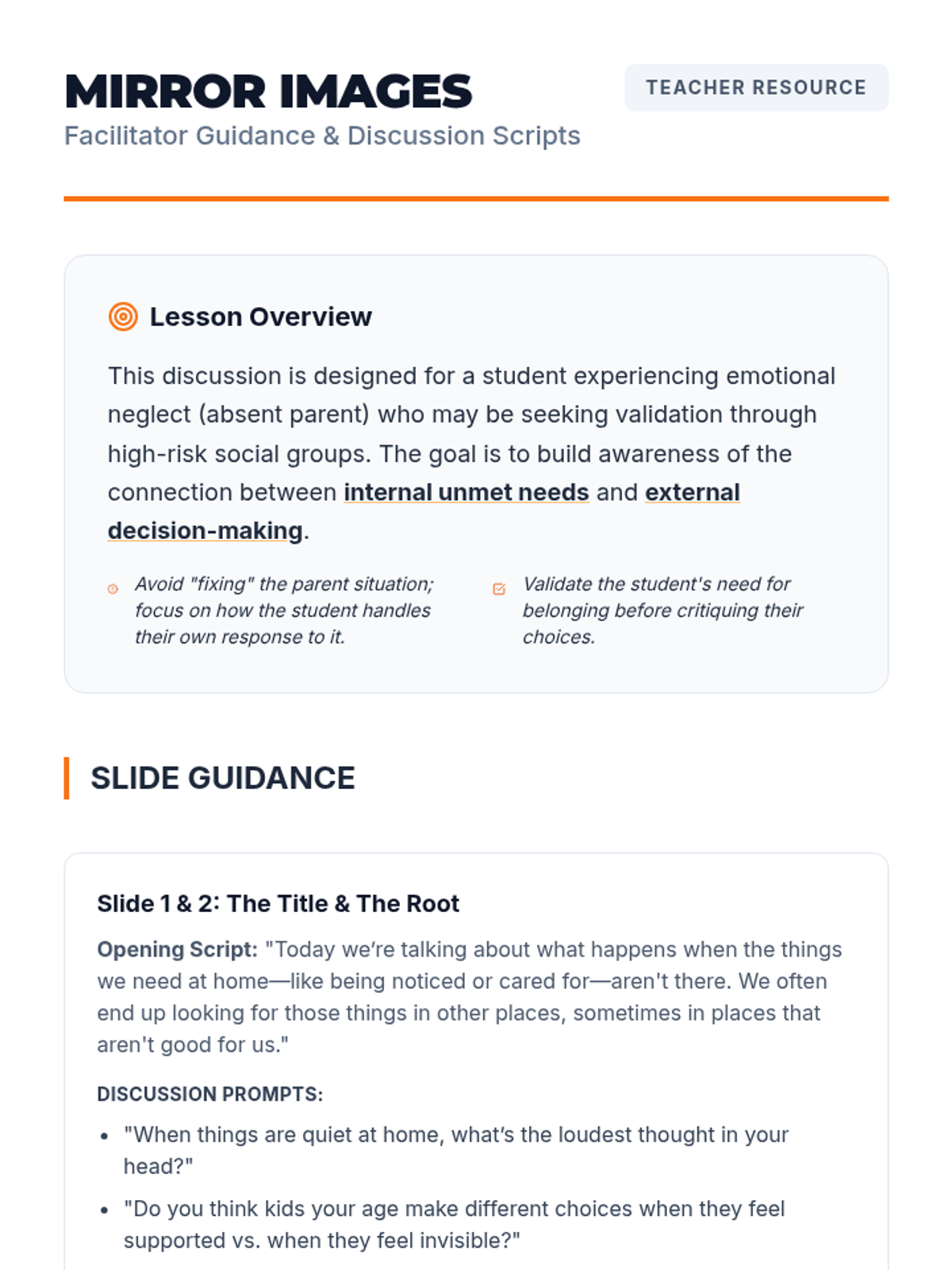 A detailed instructional guide for teachers to lead the 'Mirror Images' discussion. Includes specific scripts, psychological framing for 9th graders, and analysis prompts for the case study.