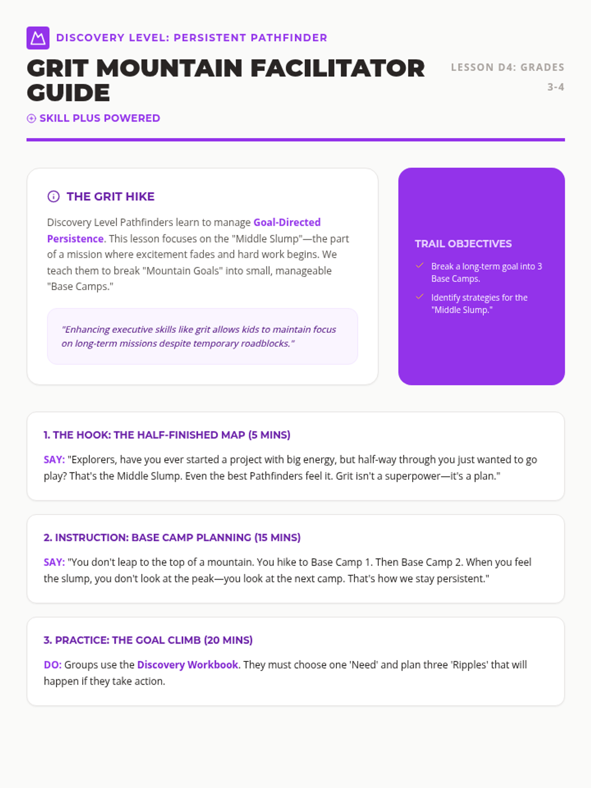 Facilitator script for Discovery Level Lesson 4: Grit Mountain, teaching grades 3-4 how to set milestones and overcome the "middle slump."