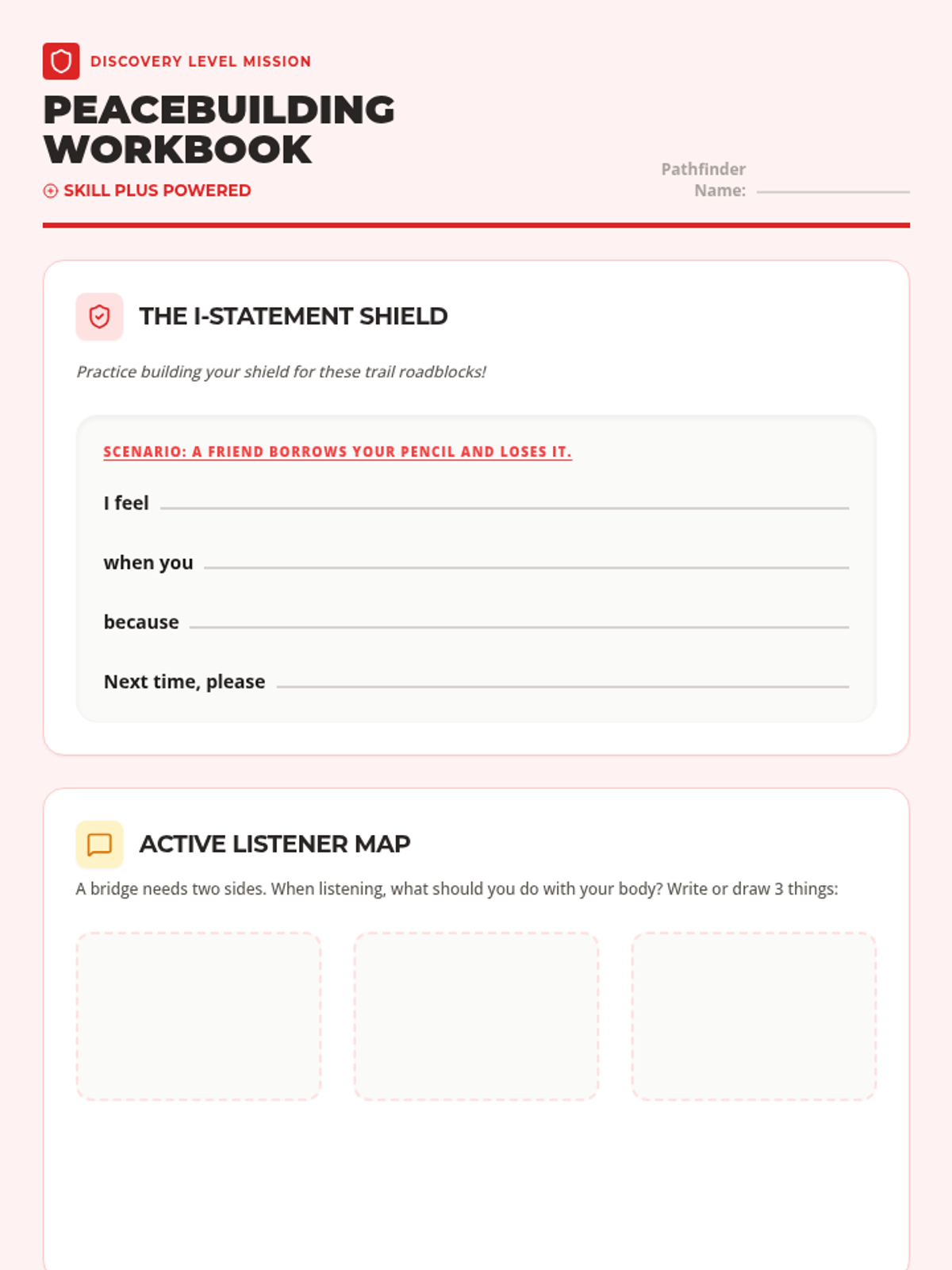 Expanded two-page student workbook for Discovery Level Lesson 2: Peacebuilding, teaching I-Statements and perspective taking for grades 3-4.