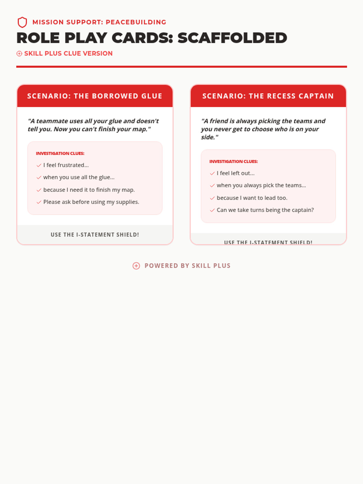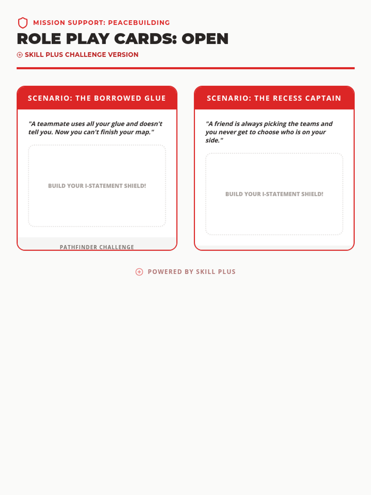 Open role play cards for Discovery Level Lesson 2: Peacebuilding, challenge scenarios for independent I-Statement practice for grades 3-4.