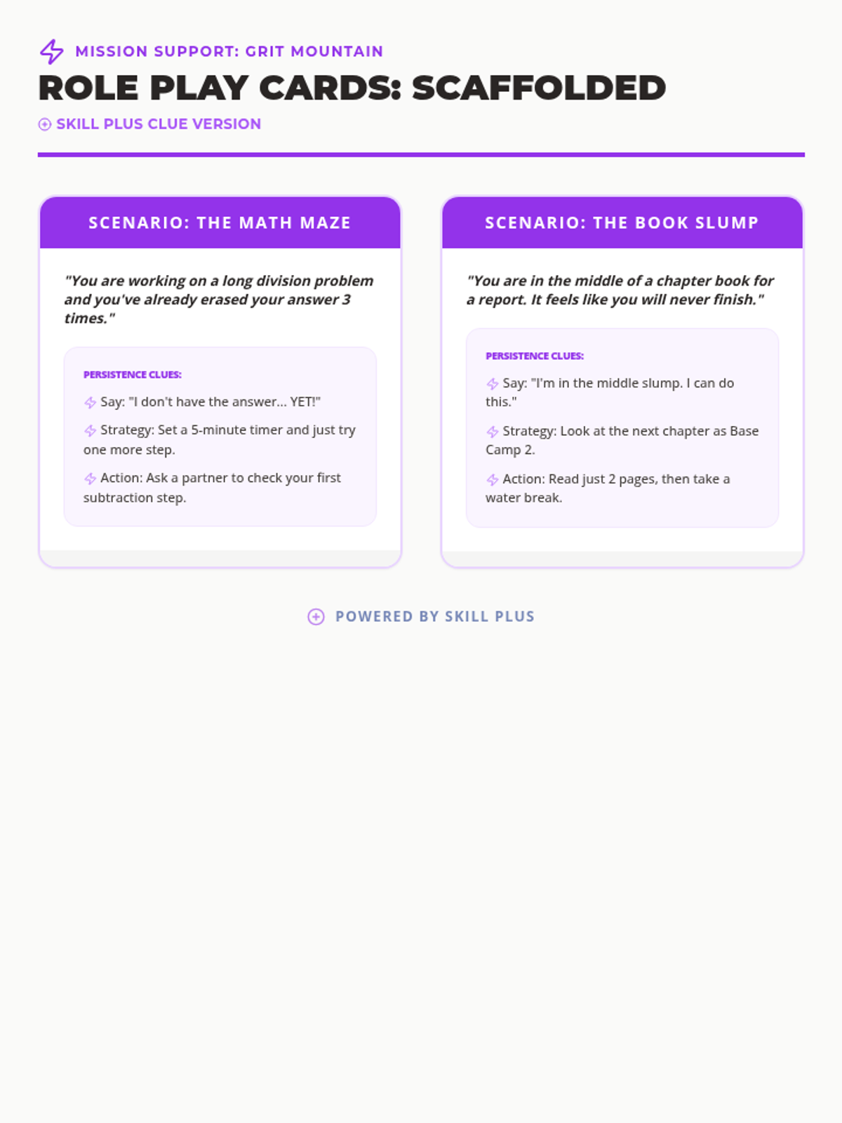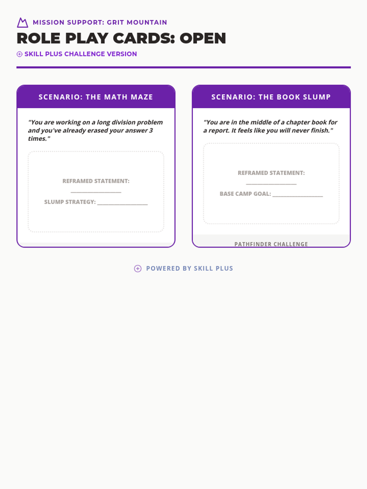 Open role play cards for Discovery Level Lesson 4: Grit Mountain, challenge scenarios for independent grit practice for grades 3-4.
