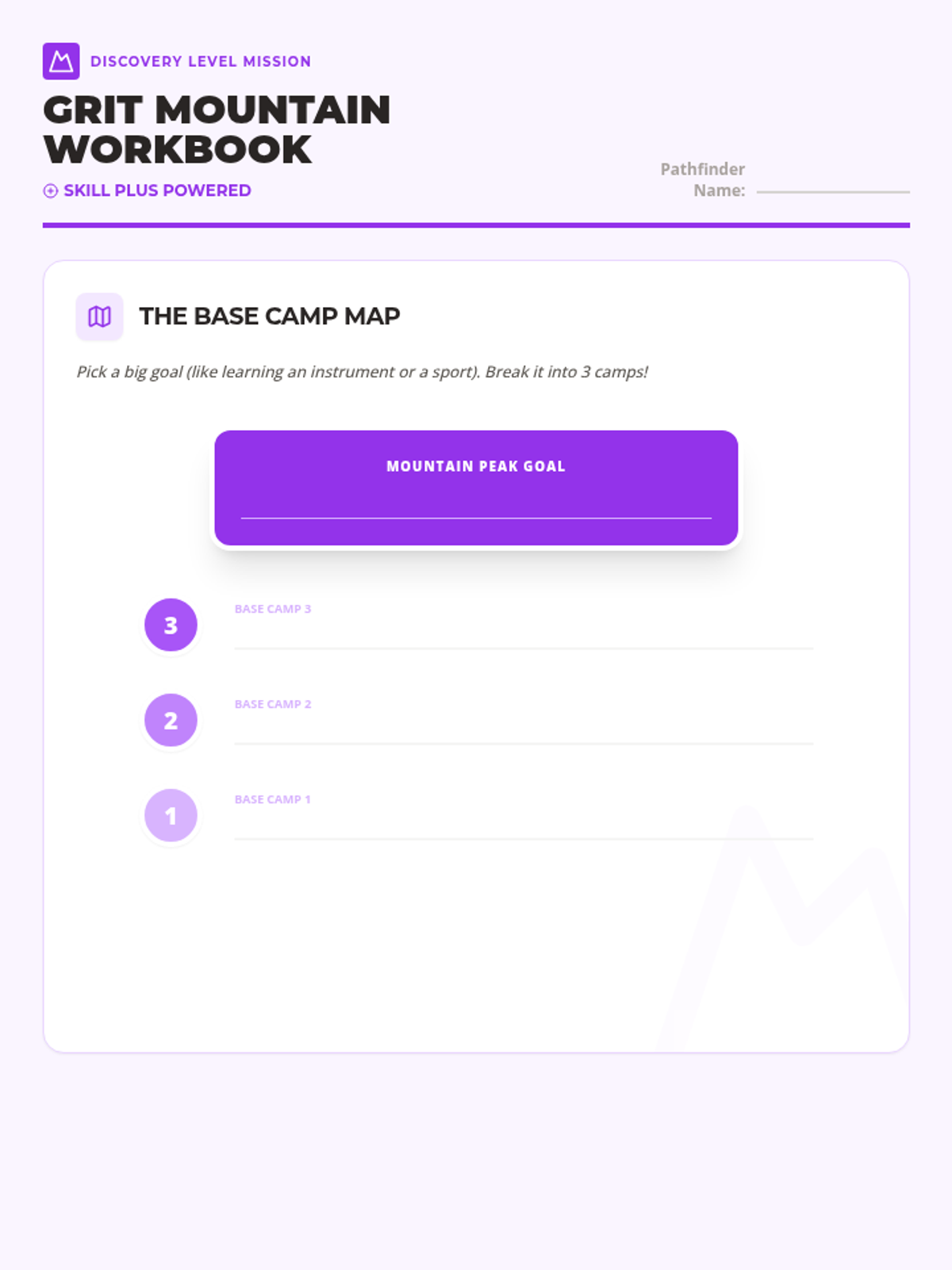 Expanded two-page student workbook for Discovery Level Lesson 4: Grit Mountain, teaching goal-setting and the "middle slump" for grades 3-4.