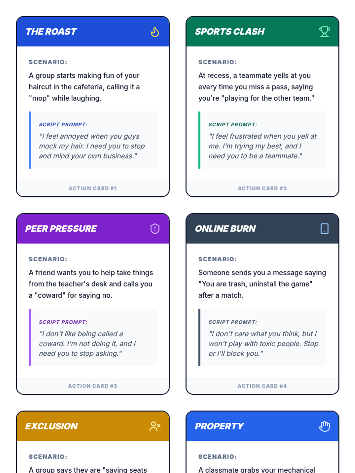 A set of 6 role-play scenario cards designed for 5th-grade boys. Each card includes a relatable social situation (roasting, sports, peer pressure, online toxicity, exclusion, and property boundaries) and a provided assertive script prompt. Each card is complete and actionable.