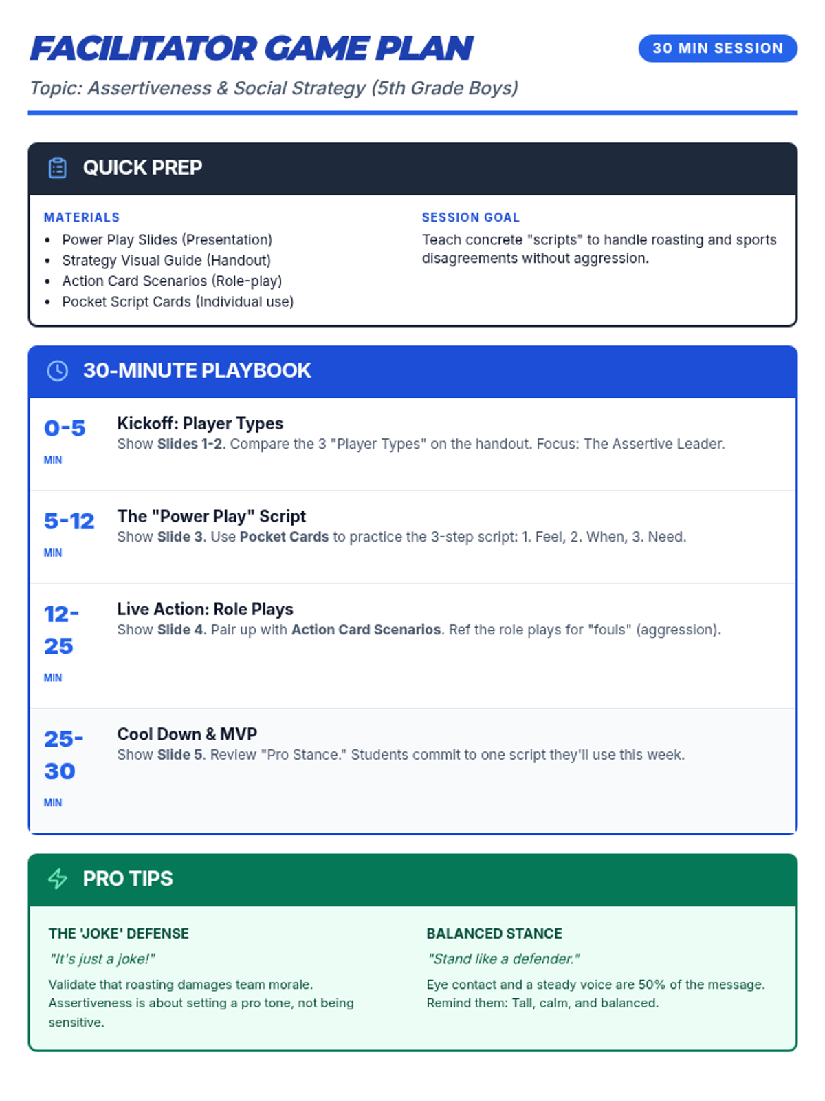 A 30-minute facilitator game plan for a small group session for 5th-grade boys, featuring a timed playbook, material list, and facilitation tips for teaching assertiveness.