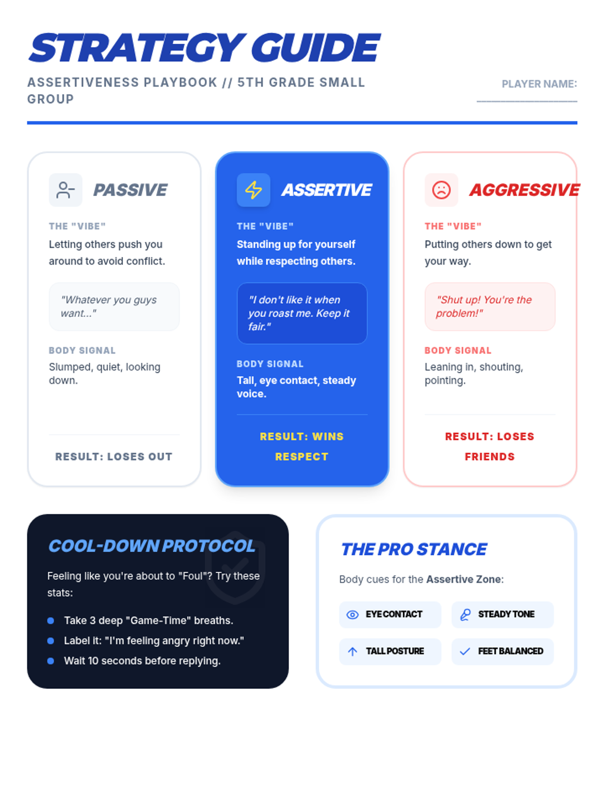 A visual guide comparing Assertive, Passive, and Aggressive communication styles using a sports/gaming 'Player Type' theme. It includes body language tips and 'cool-down protocols' specifically designed for 5th-grade boys.