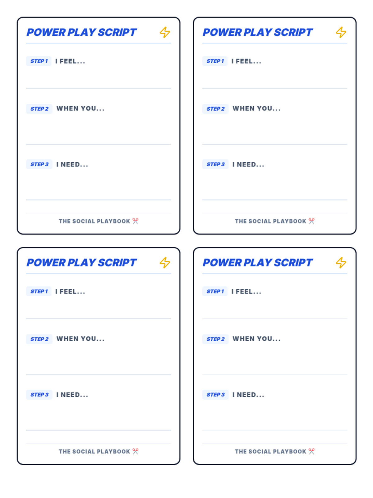 A set of 4 pocket-sized reference cards for students, featuring the 3-step 'Power Play' I-statement script with fill-in-the-blank lines for student practice. Designed to be cut out and kept as a portable reminder. Cards are optimized for 5th-grade handwriting space.