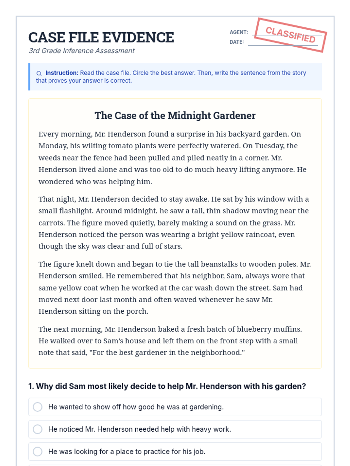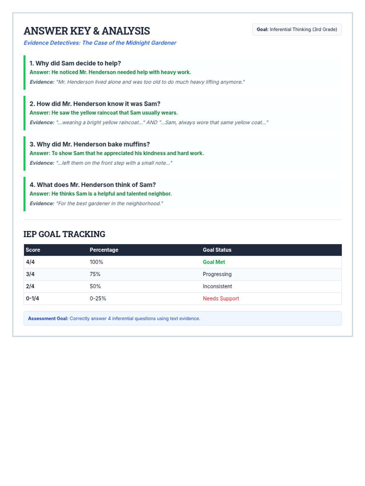 An expanded 3rd-grade reading assessment featuring "The Case of the Missing Mittens." Now includes 8 total inferential and critical thinking questions (including 4 new "Why" questions) to track IEP progress. Styled as a 2-page detective case file with dashed writing lines and improved page layout.