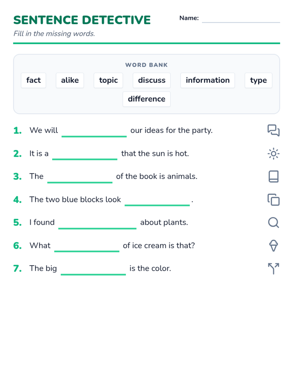 A fill-in-the-blank worksheet with simple sentences and a word bank for 4th-grade students with limited literacy. Revised for 1-page layout and improved visual contrast.