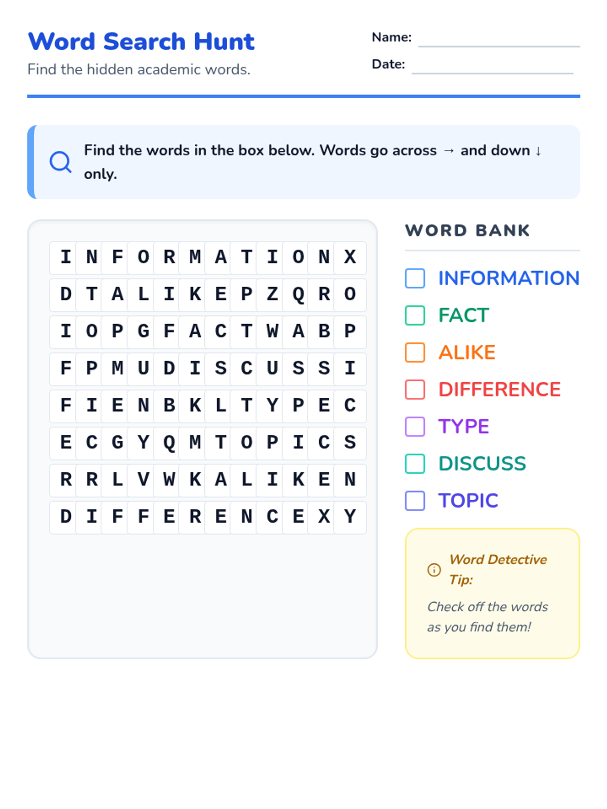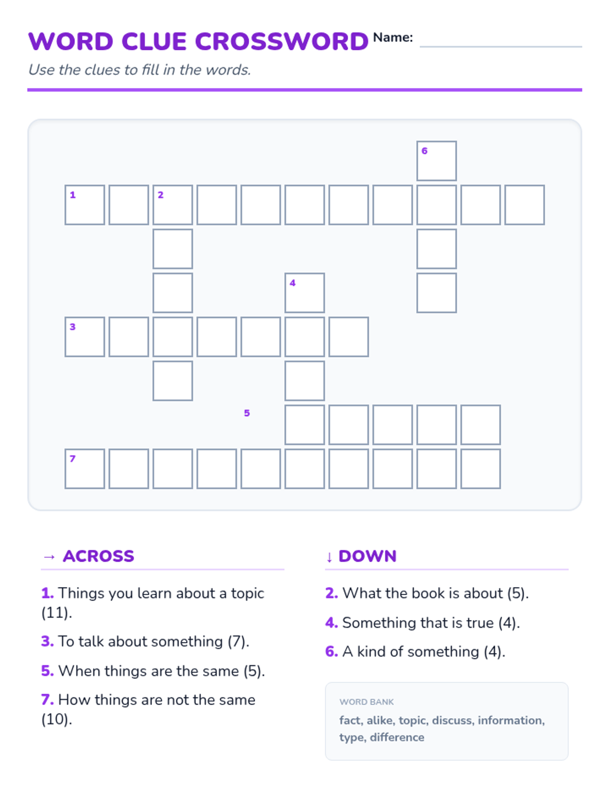 A simple academic vocabulary crossword puzzle for 4th-grade students with limited literacy. Revised with larger boxes, correct intersections, and clear clue numbers.