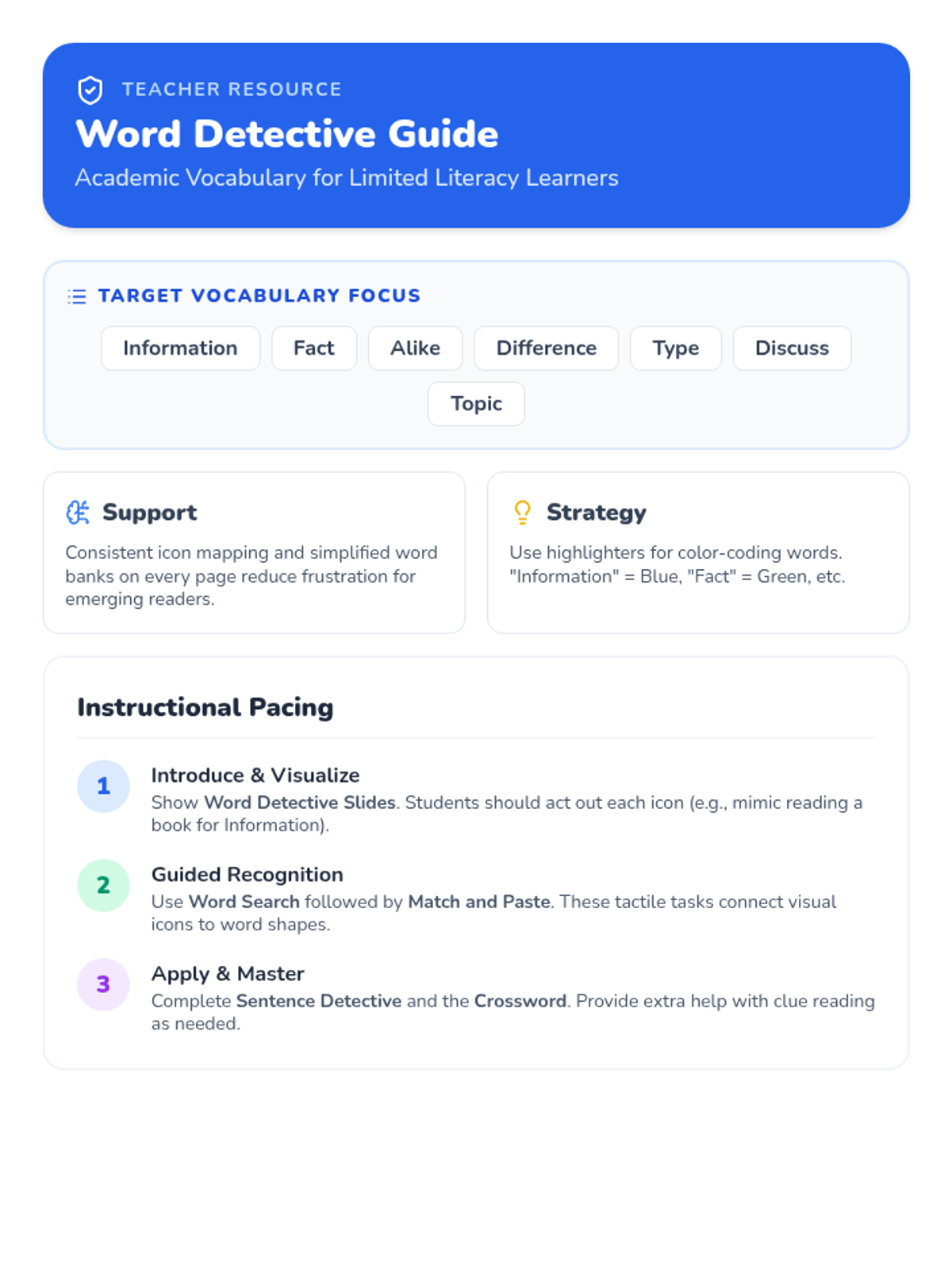 A teacher guide providing instructional strategies and literacy support tips. Revised to fit on a single page and list the 7 target words clearly.