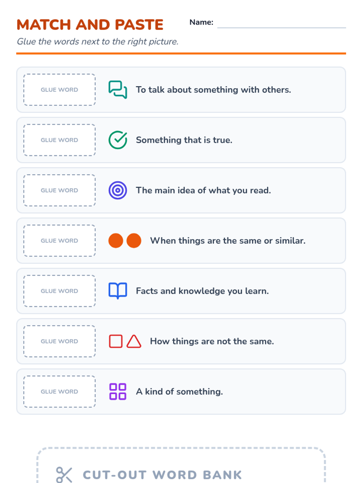 A cut-and-paste matching activity for academic vocabulary. Revised to fit all matching items on one page and use uniform text colors for cutouts to encourage reading comprehension. Corrected page breaks for cut-out bank.
