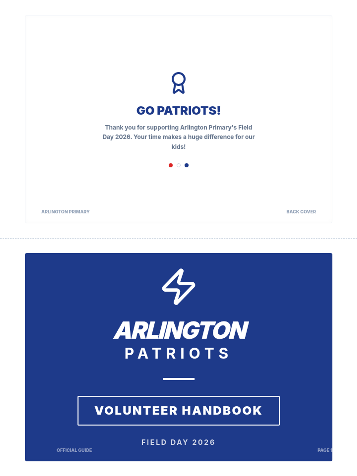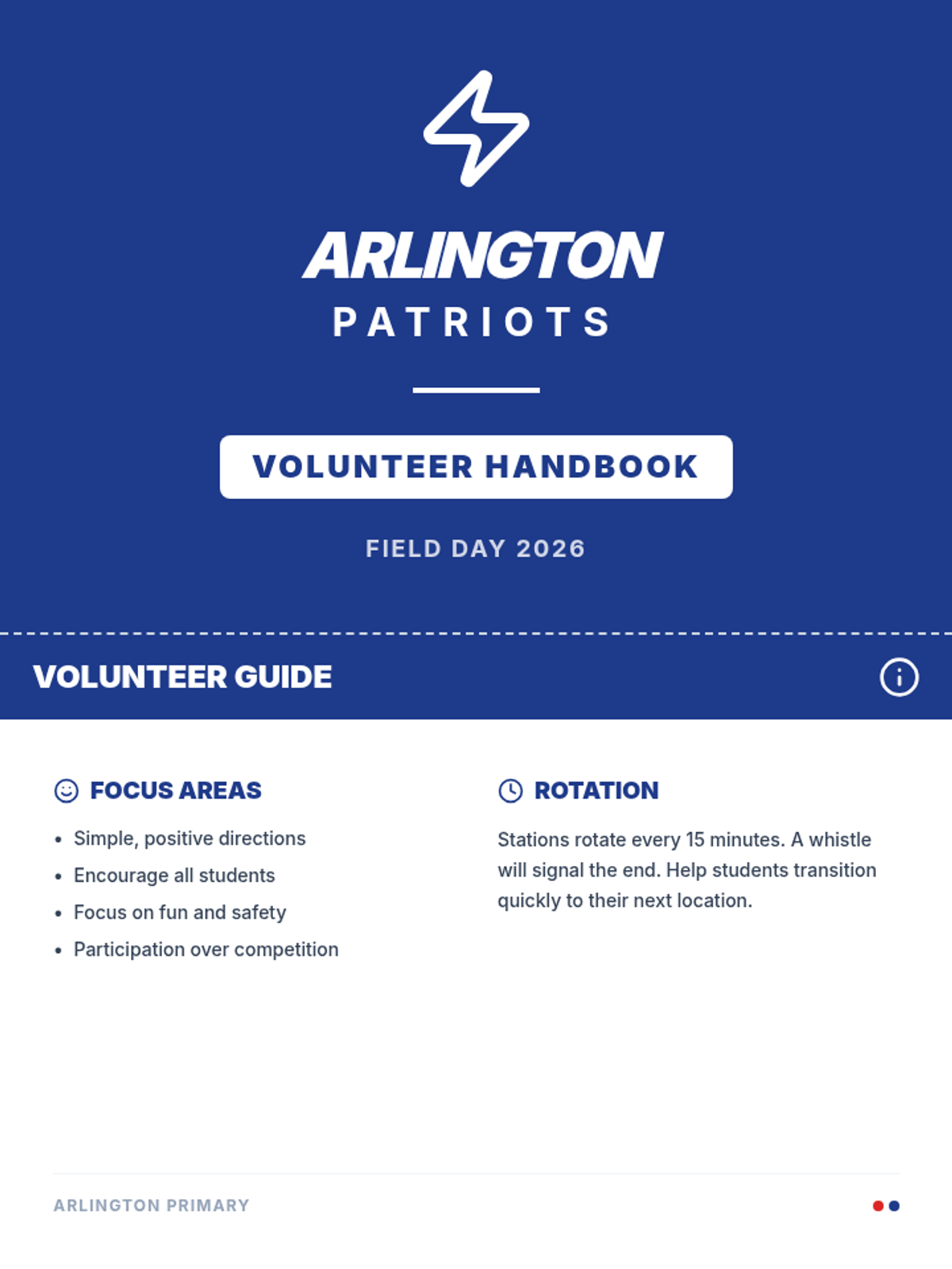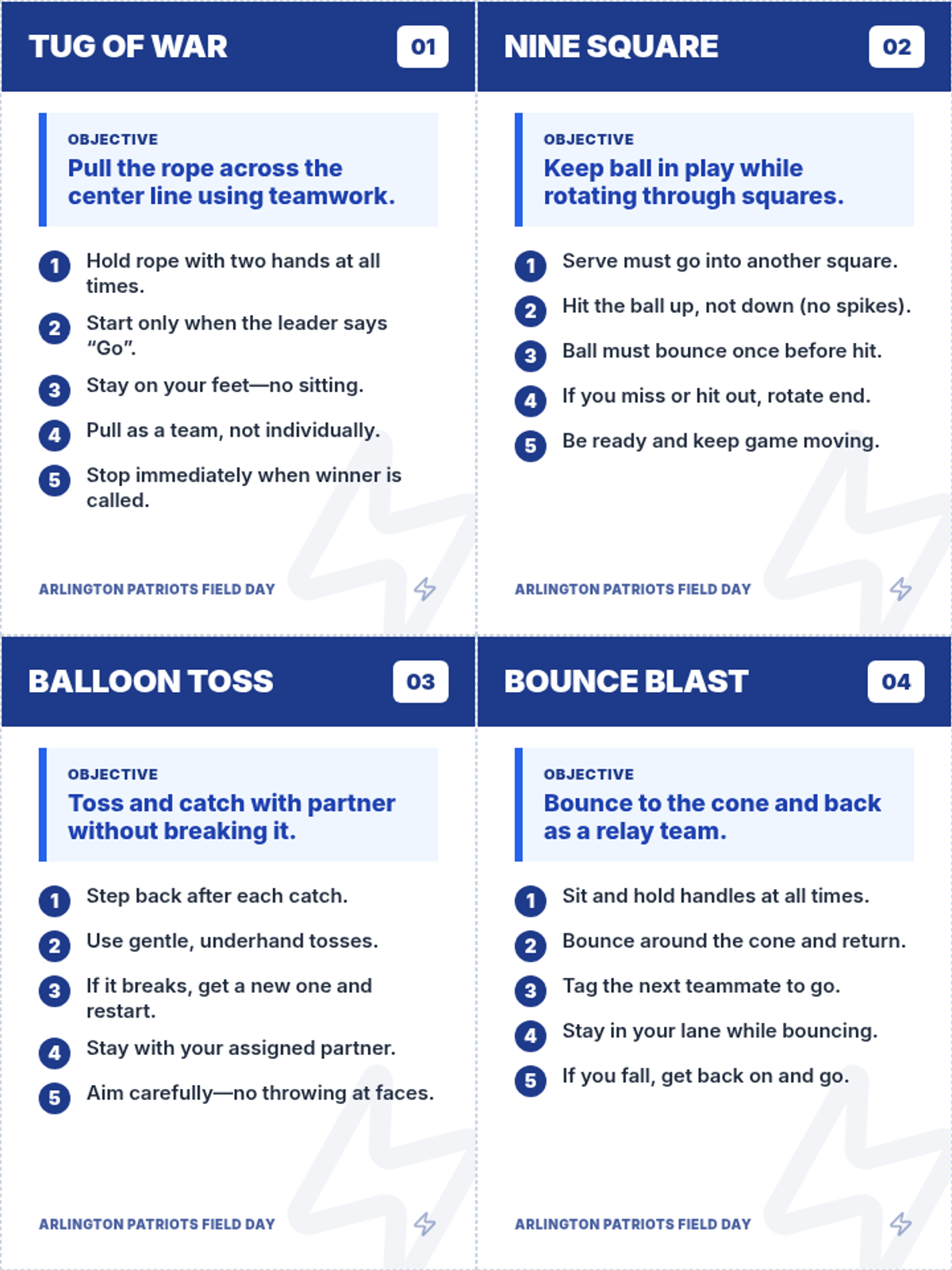 A set of 10 printable station instruction cards formatted as 4.25" x 5.5" postcards (4 per page). Designed for teachers and volunteers, featuring the Arlington Patriots blue and white theme with high-visibility large fonts balanced for readability.