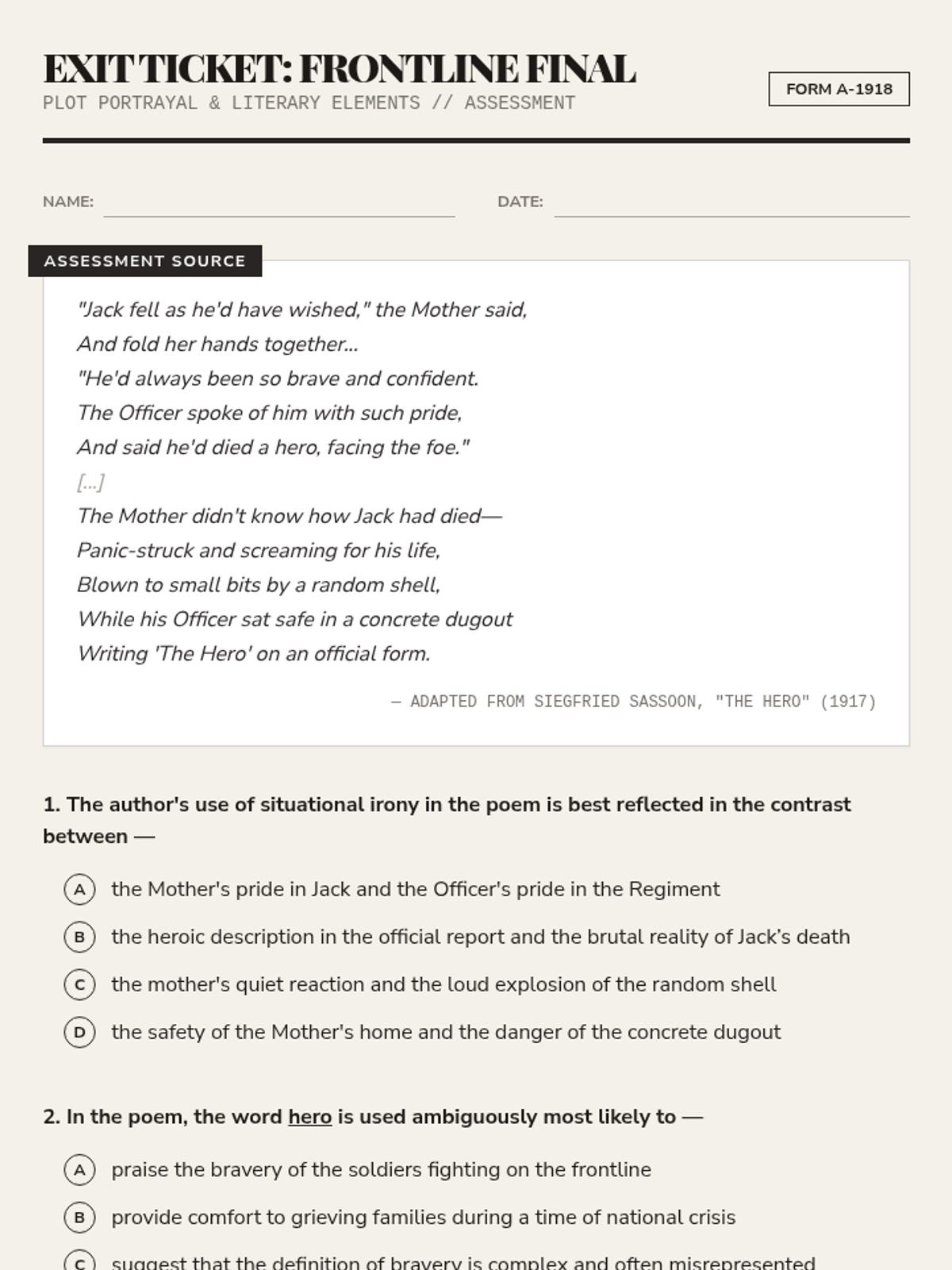 A STAAR-formatted exit ticket for analyzing how literary elements (situational irony, ambiguity, setting) shape the author's portrayal of the plot in Siegfried Sassoon's poem "The Hero." Updated for alignment.