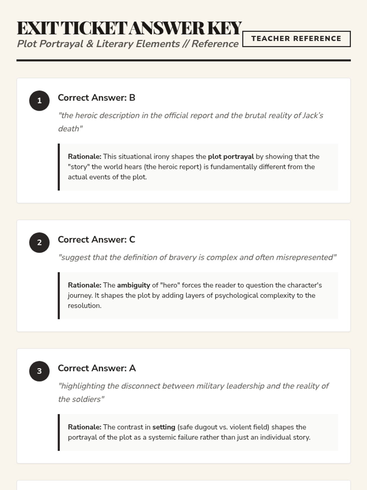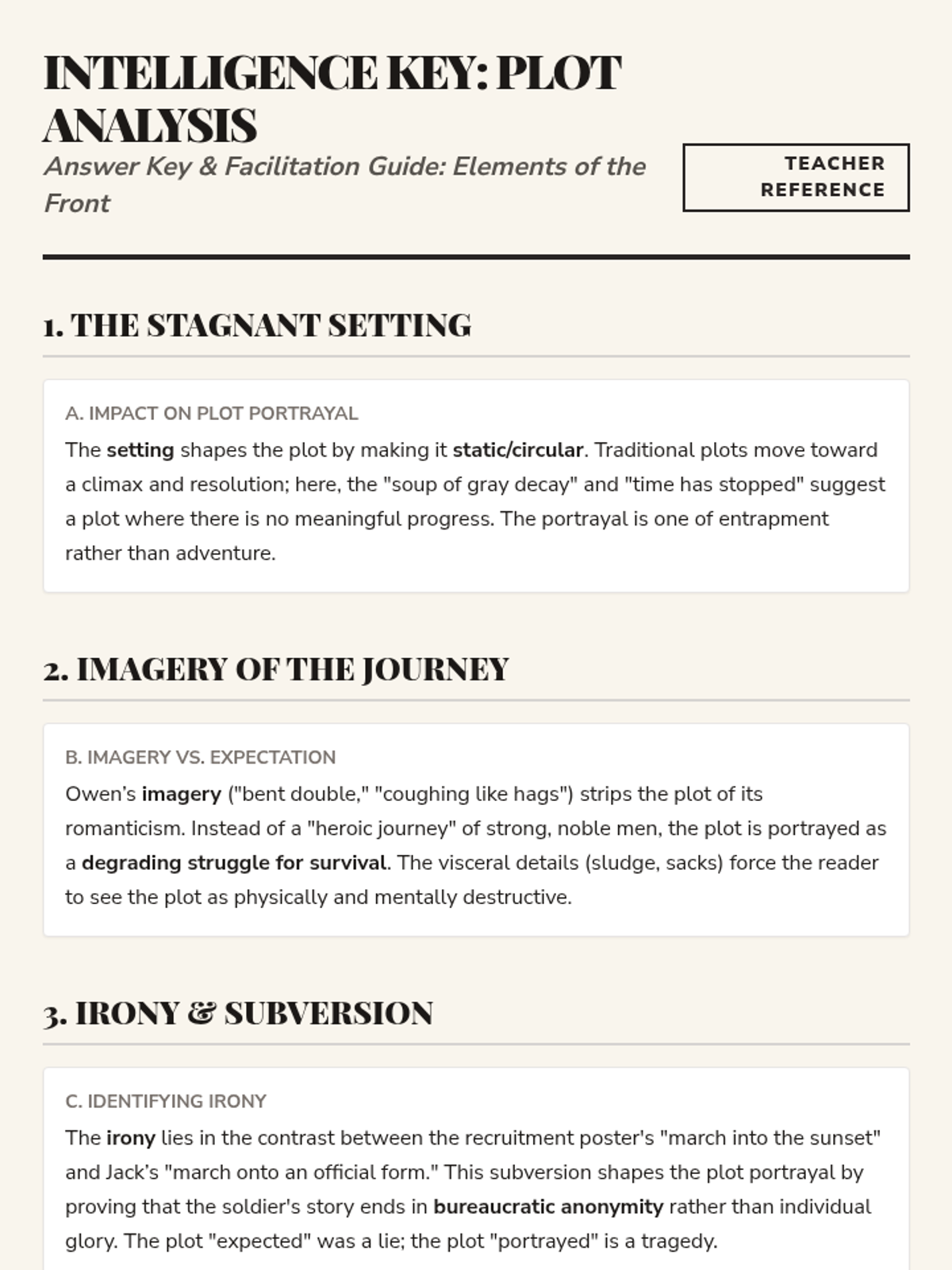 Updated intelligence key and facilitation guide for the plot analysis worksheet. Provides detailed explanations for how setting, imagery, and irony shape plot portrayal.