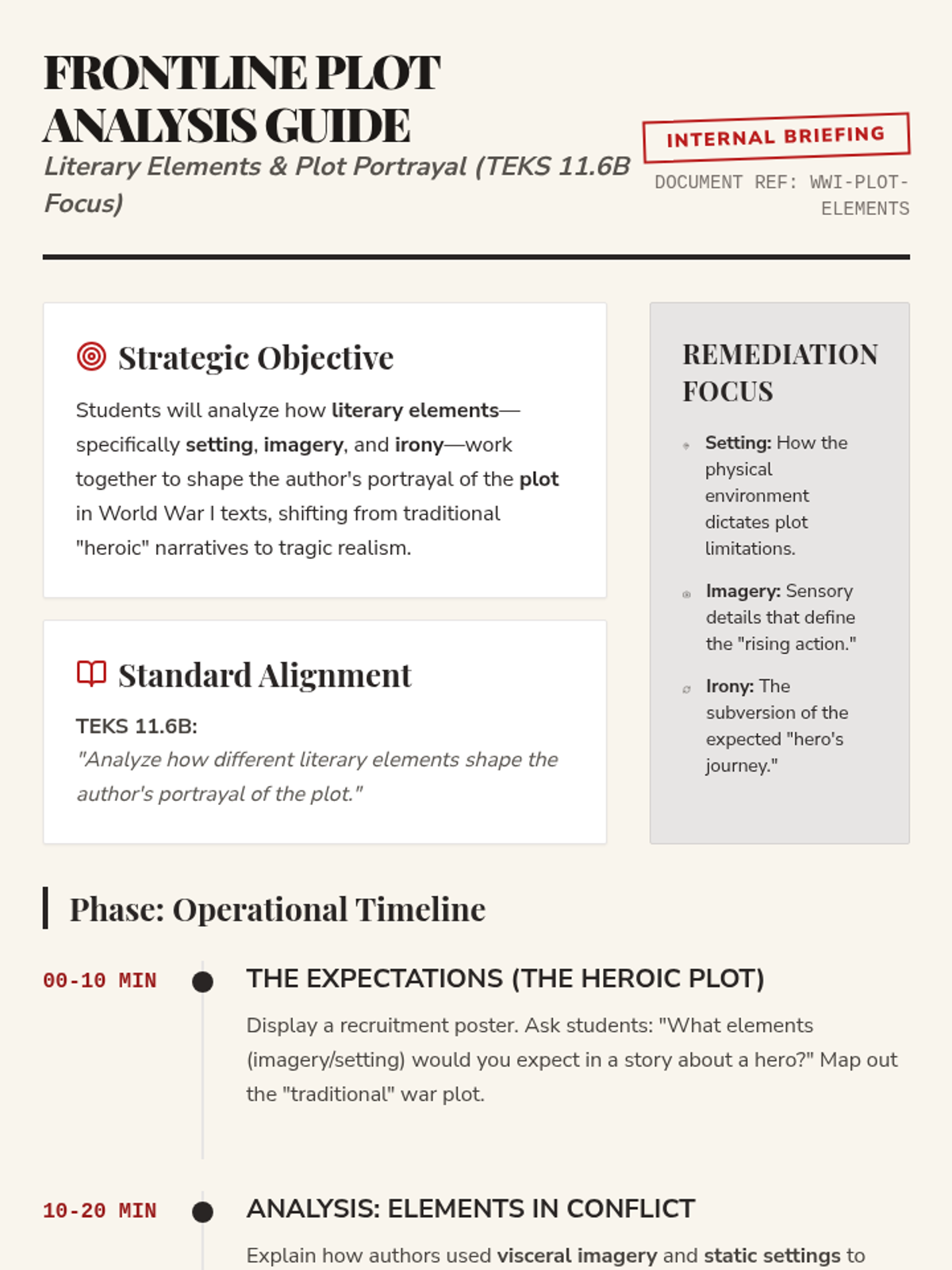 Updated teacher guide for a 45-minute remediation focused on how literary elements (setting, imagery, irony) shape the portrayal of the plot in WWI texts. Provides a strategic objective, standard alignment, and timeline.
