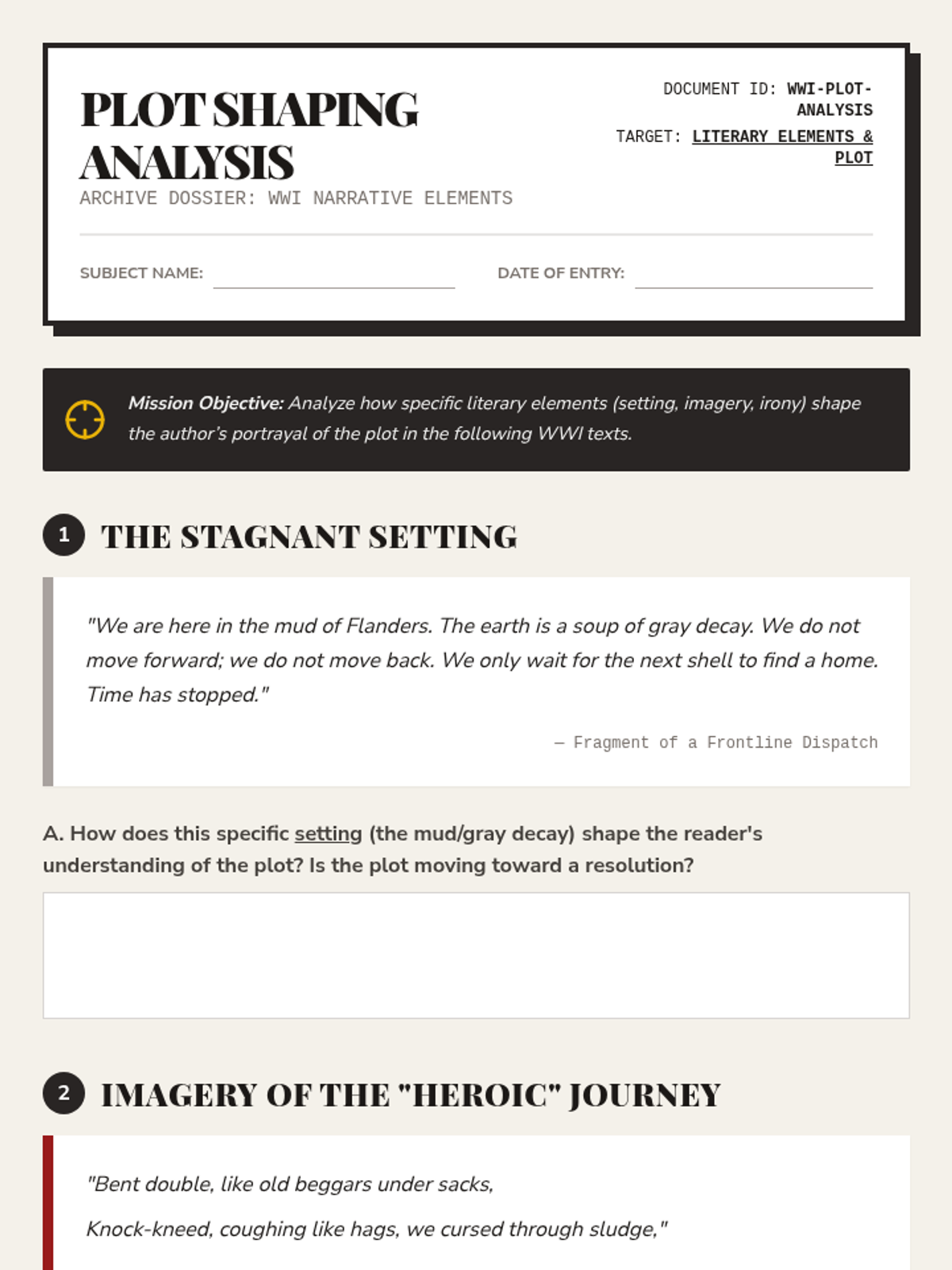 Updated student analysis worksheet focusing on how literary elements (setting, imagery, irony) shape the portrayal of the plot in WWI texts. Features fragments and poetry snippets for analysis.