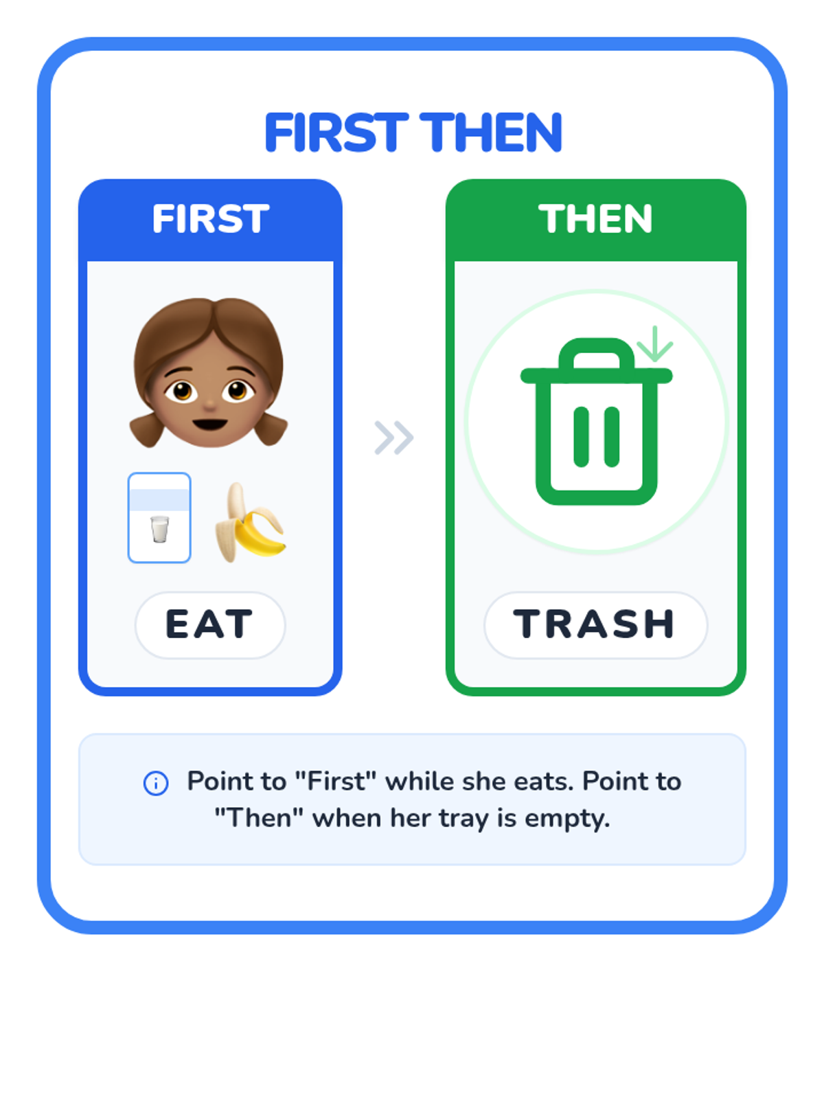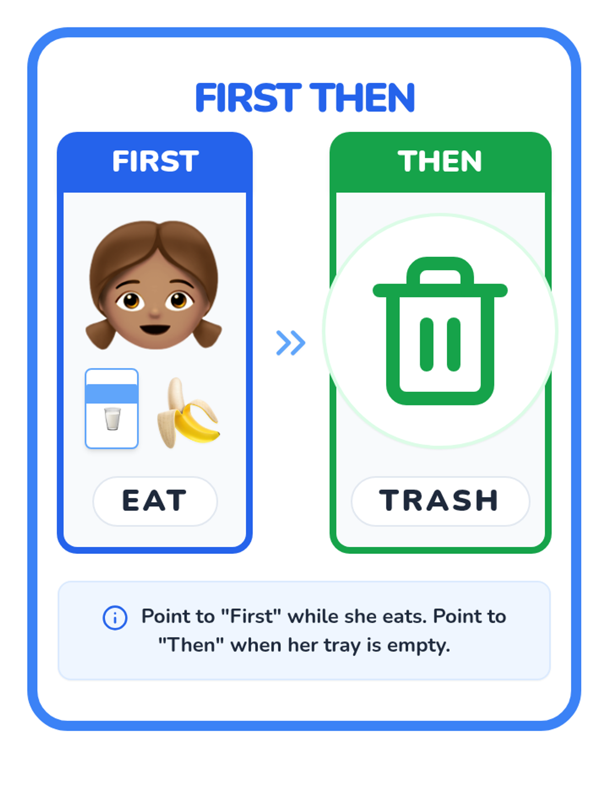 A high-contrast First-Then visual board designed for a kindergarten student. It features an African American girl eating breakfast (First) and a trash can for disposal (Then) to support the transition routine. Updated for better layout and specific food visuals.