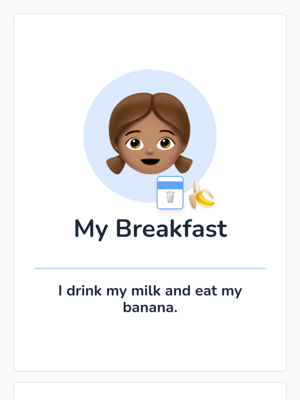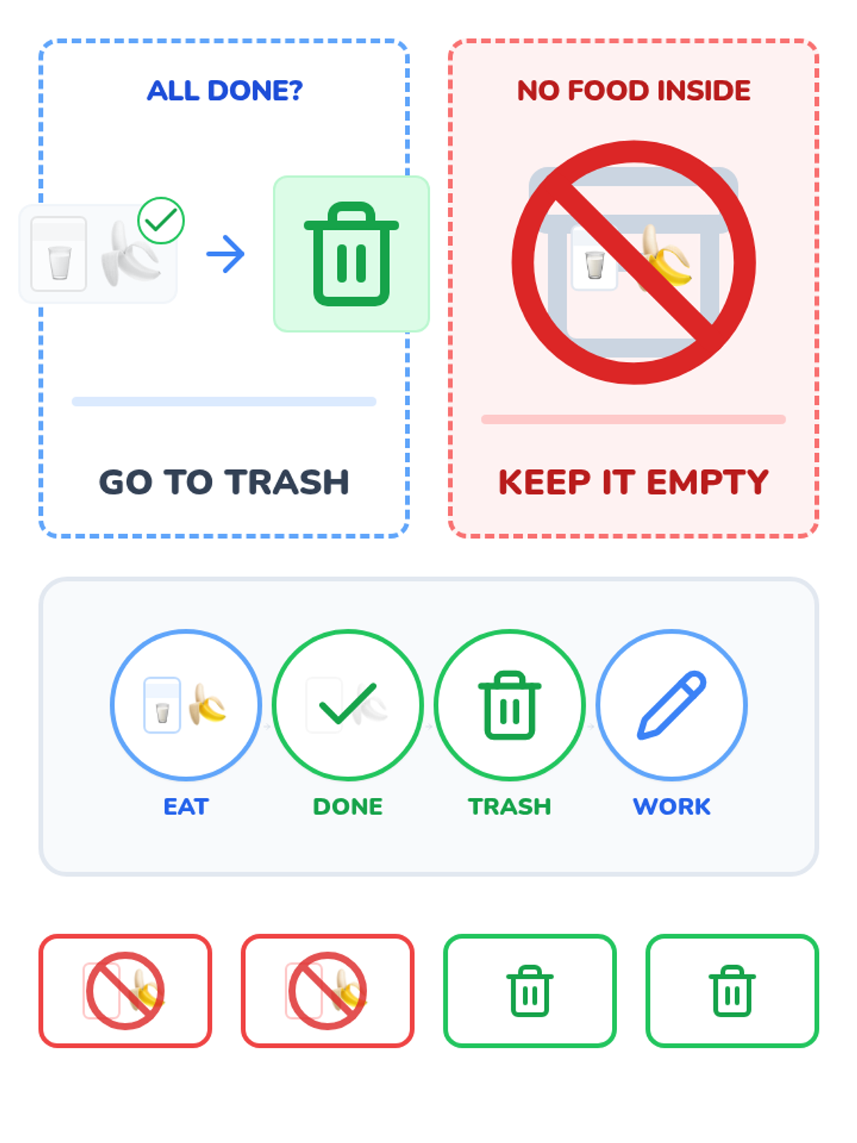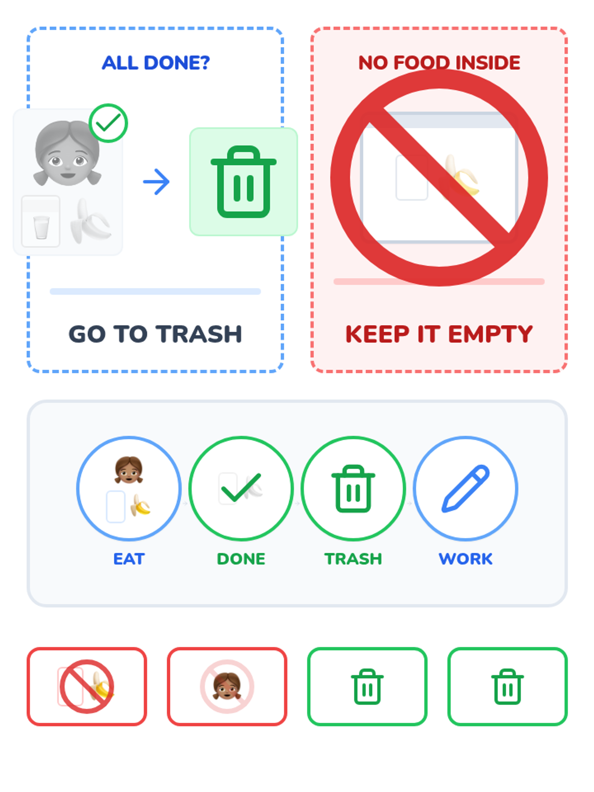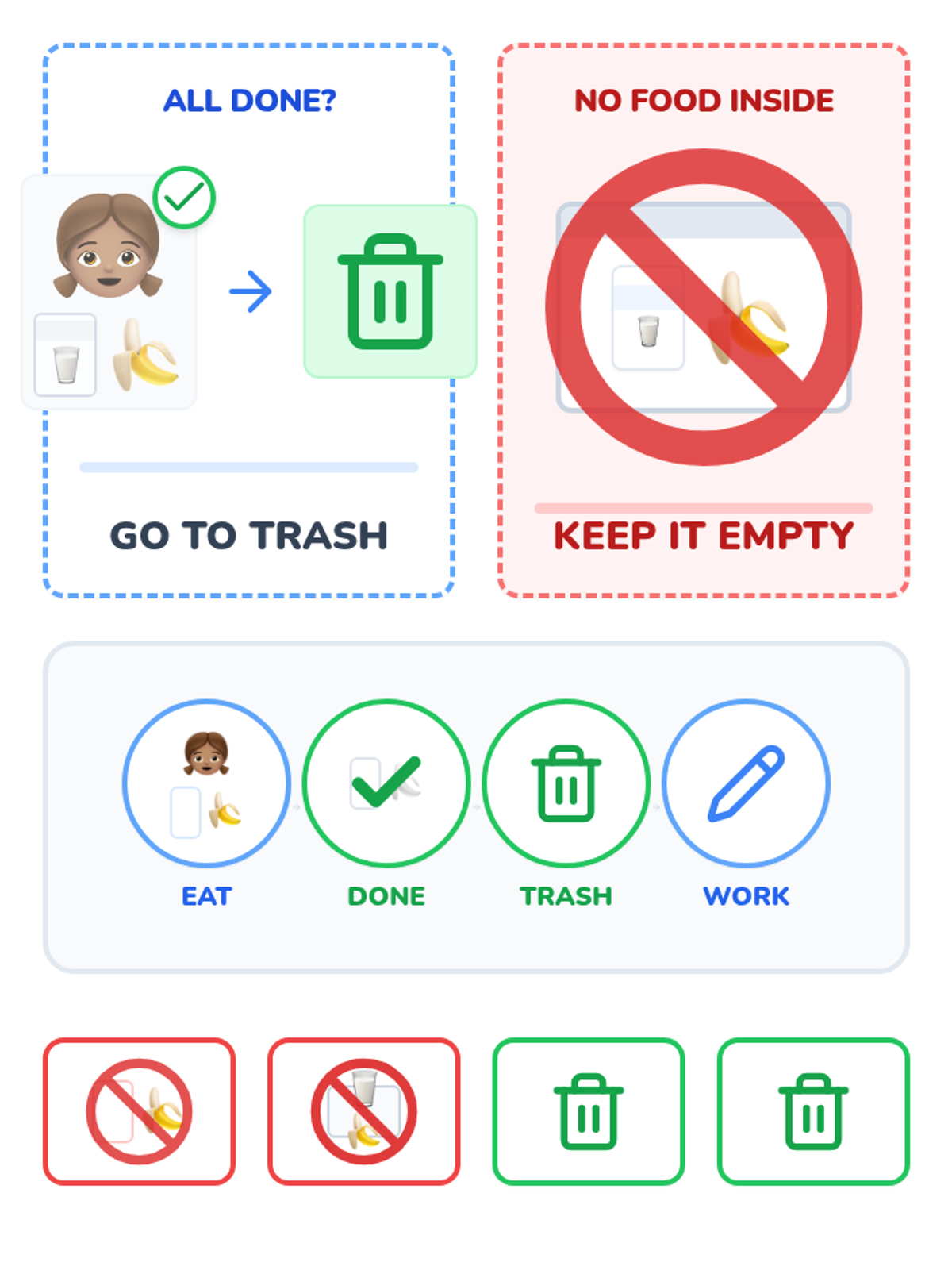 Highly visual desk cards for a non-reading kindergartener. Includes specific emojis for milk and bananas with "No" symbols to clearly communicate the cleanup expectation.