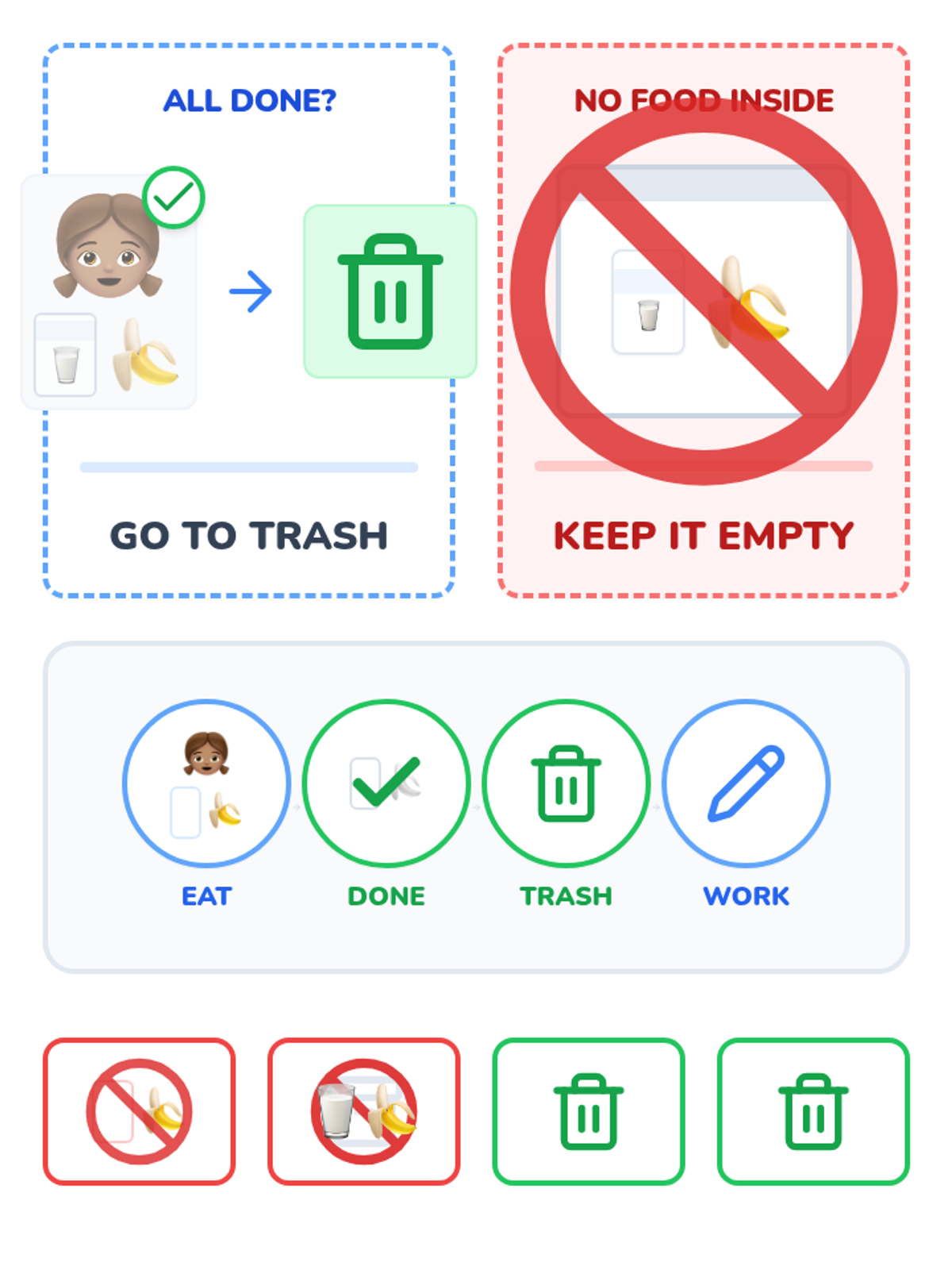 Visual reminder cards for a student's desk, including a finished-to-trash transition card, an 'inside desk' warning sign, and a sequence strip for breakfast routines. Updated terminology for consistency.