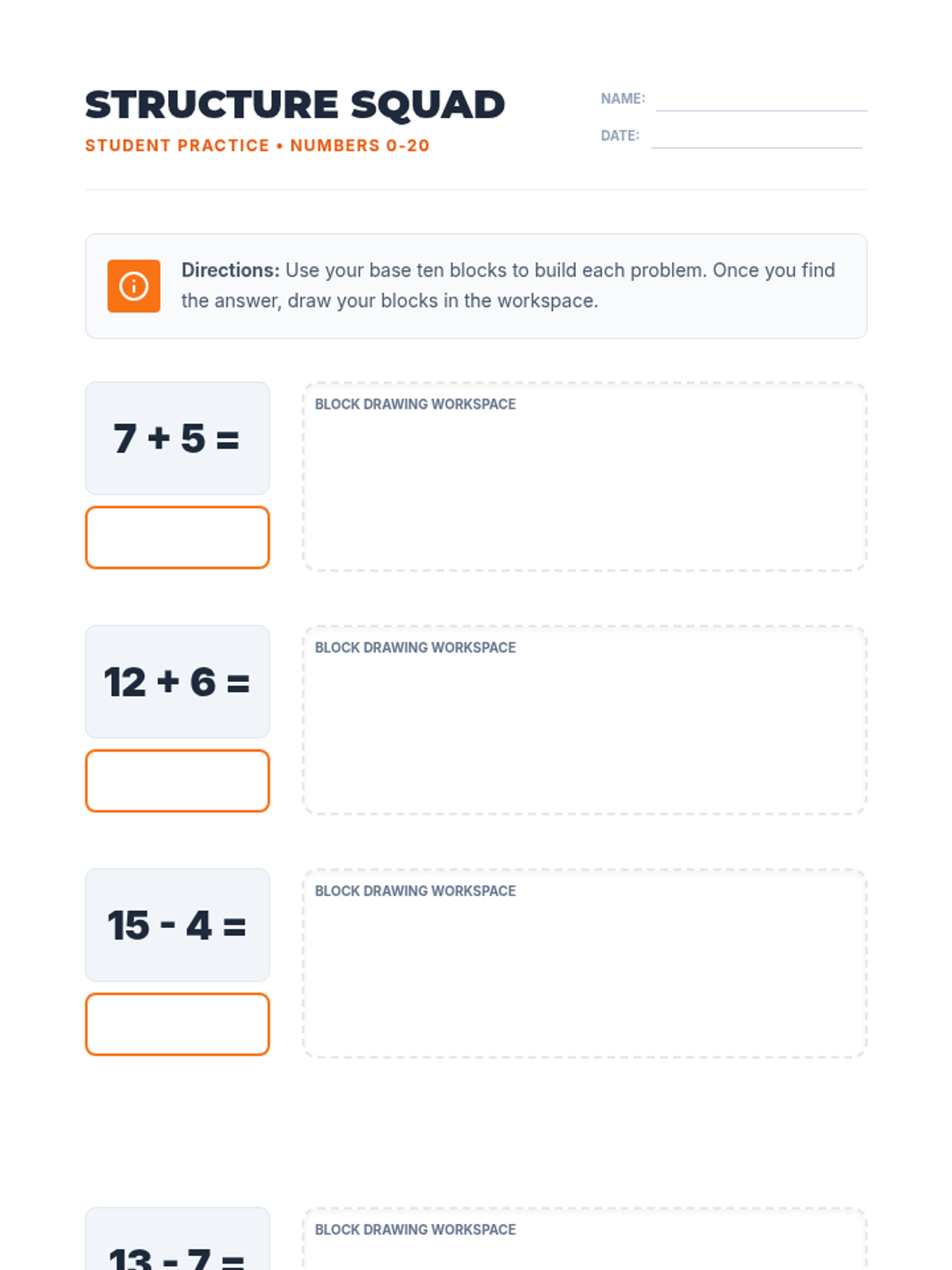 A student practice worksheet featuring addition and subtraction problems within 20. Includes dedicated workspaces for students to draw their base ten block models, reinforcing the link between concrete manipulatives and representational drawings.