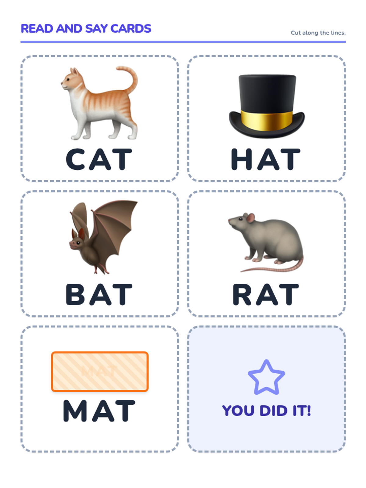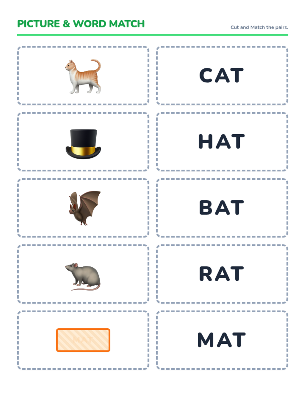 A matching game featuring the '-at' word family. Includes two sets of cards: one with icons and one with words. Students can play memory or simple matching games to reinforce the connection between visual concepts and their written forms.