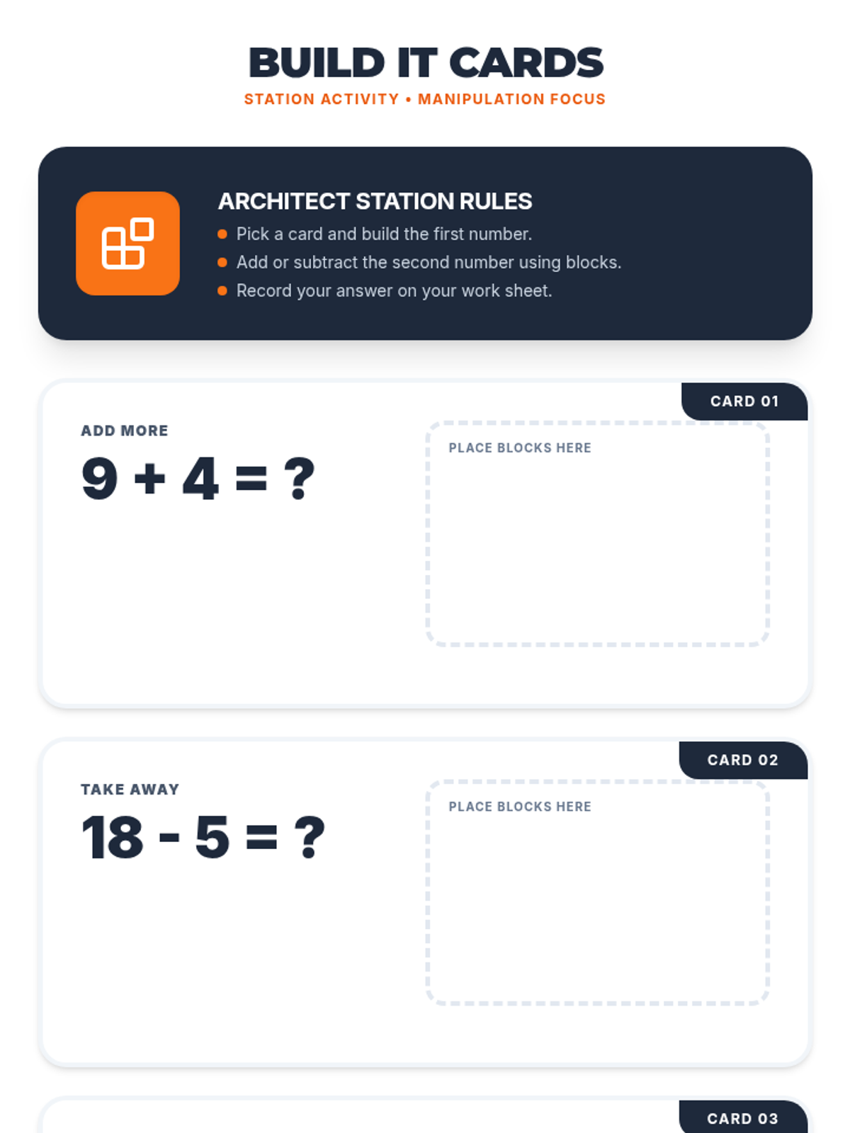 A set of 6 task cards designed for independent math stations. Each card presents an addition or subtraction problem within 20, providing a designated space for students to physically place base ten blocks to model the equation.