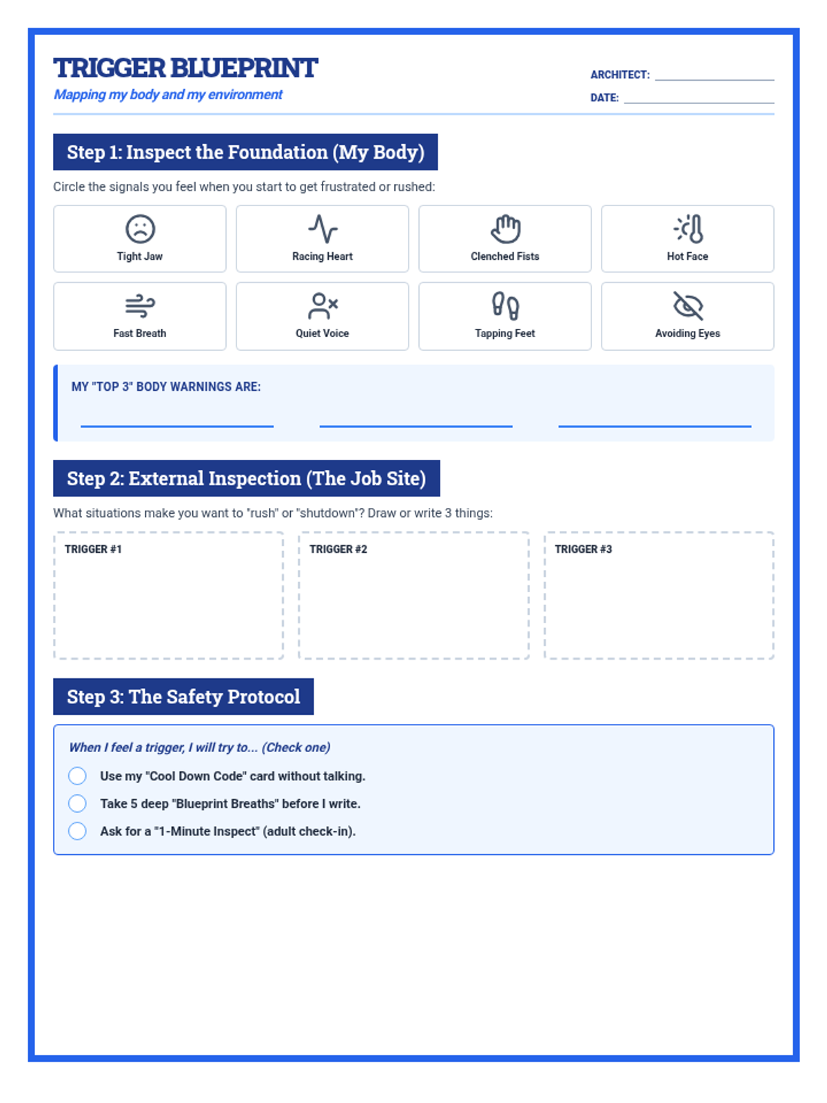 A student-facing worksheet to help identify physical body signals and environmental triggers for emotional shutdowns and rushing.
