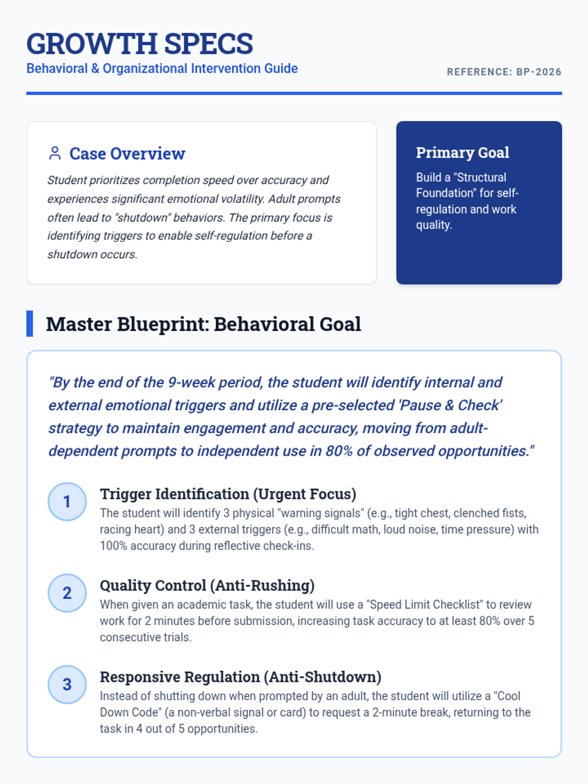 A teacher-facing guide outlining a comprehensive behavioral goal, specific objectives for trigger identification and work quality, and strategies to prevent emotional shutdowns.