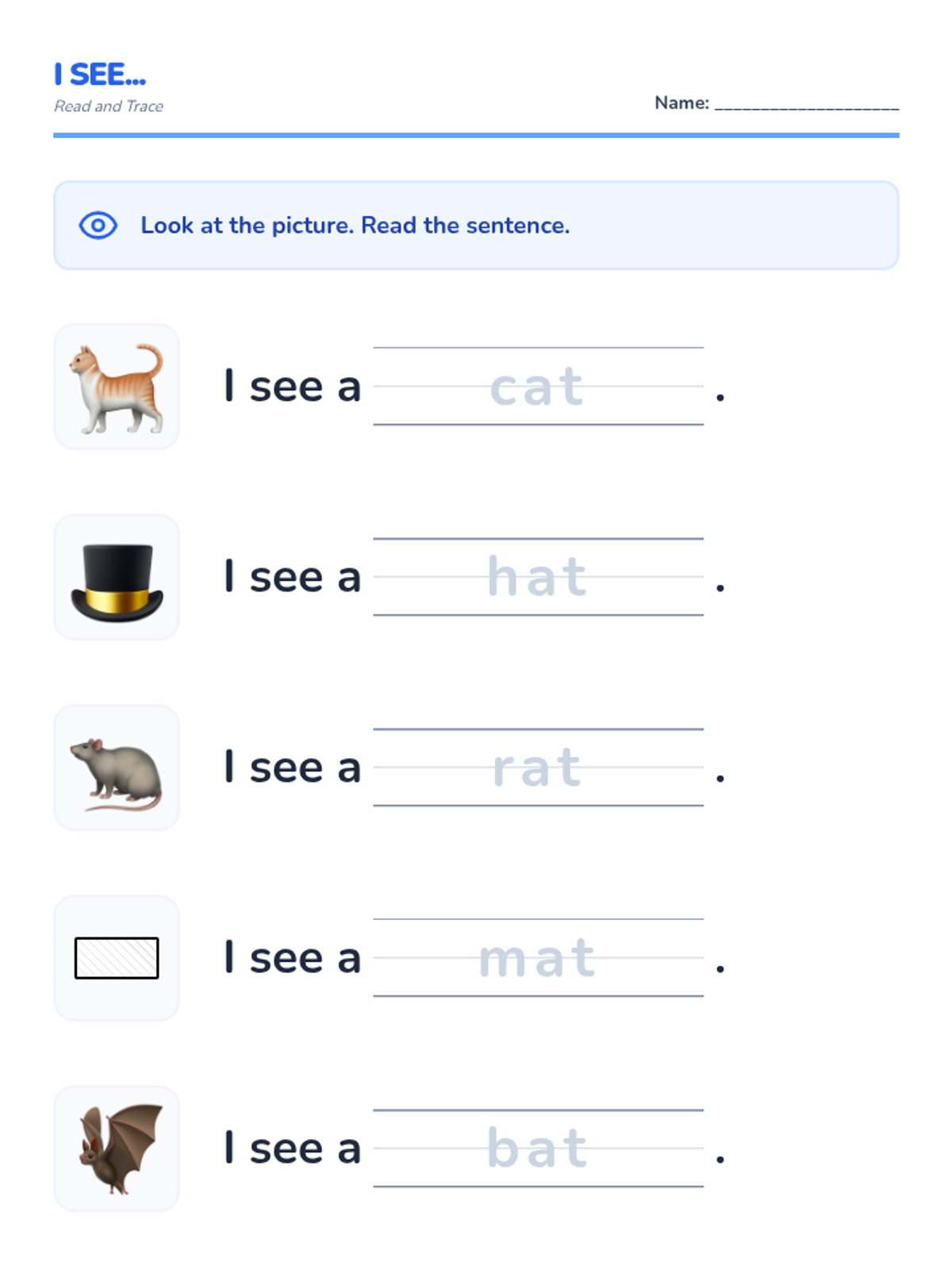 A simple fill-in-the-blank sentence worksheet for the '-at' word family. Each sentence follows the repetitive 'I see a...' structure with a ghosted word on primary lines and a corresponding visual icon to support reading and writing practice.