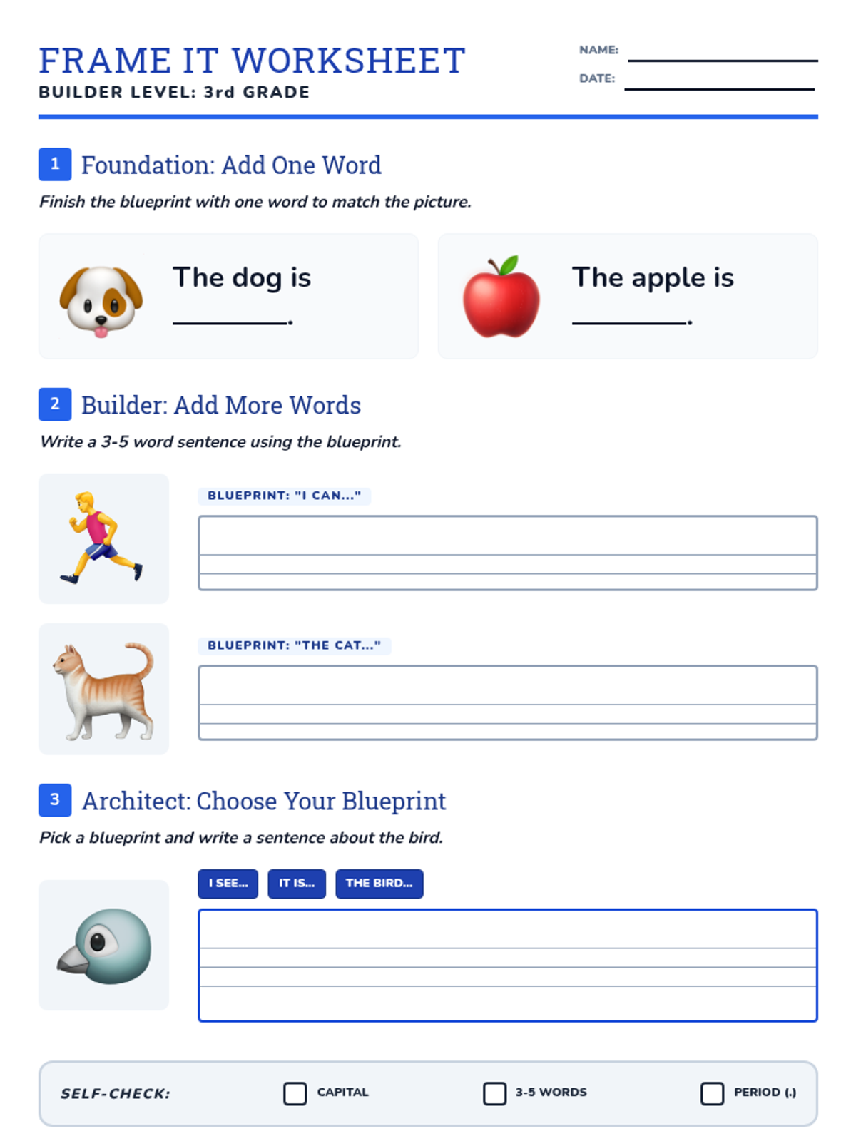 A leveled practice worksheet that guides students from filling in a single word to using a full sentence frame and eventually choosing their own frame for a 3-5 word response. Includes handwriting lines.