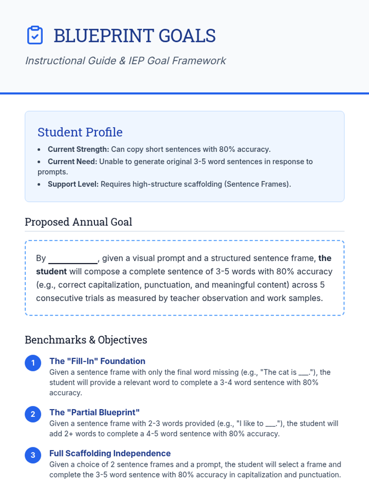 A professional teacher guide containing the proposed IEP goal, three specific benchmarks for sentence construction, and implementation strategies for a 3rd-grade student.