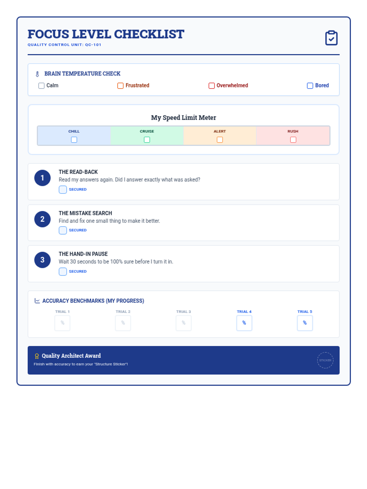 A daily self-monitoring checklist for the student to manage work speed, perform quality checks, and monitor emotional focus levels.