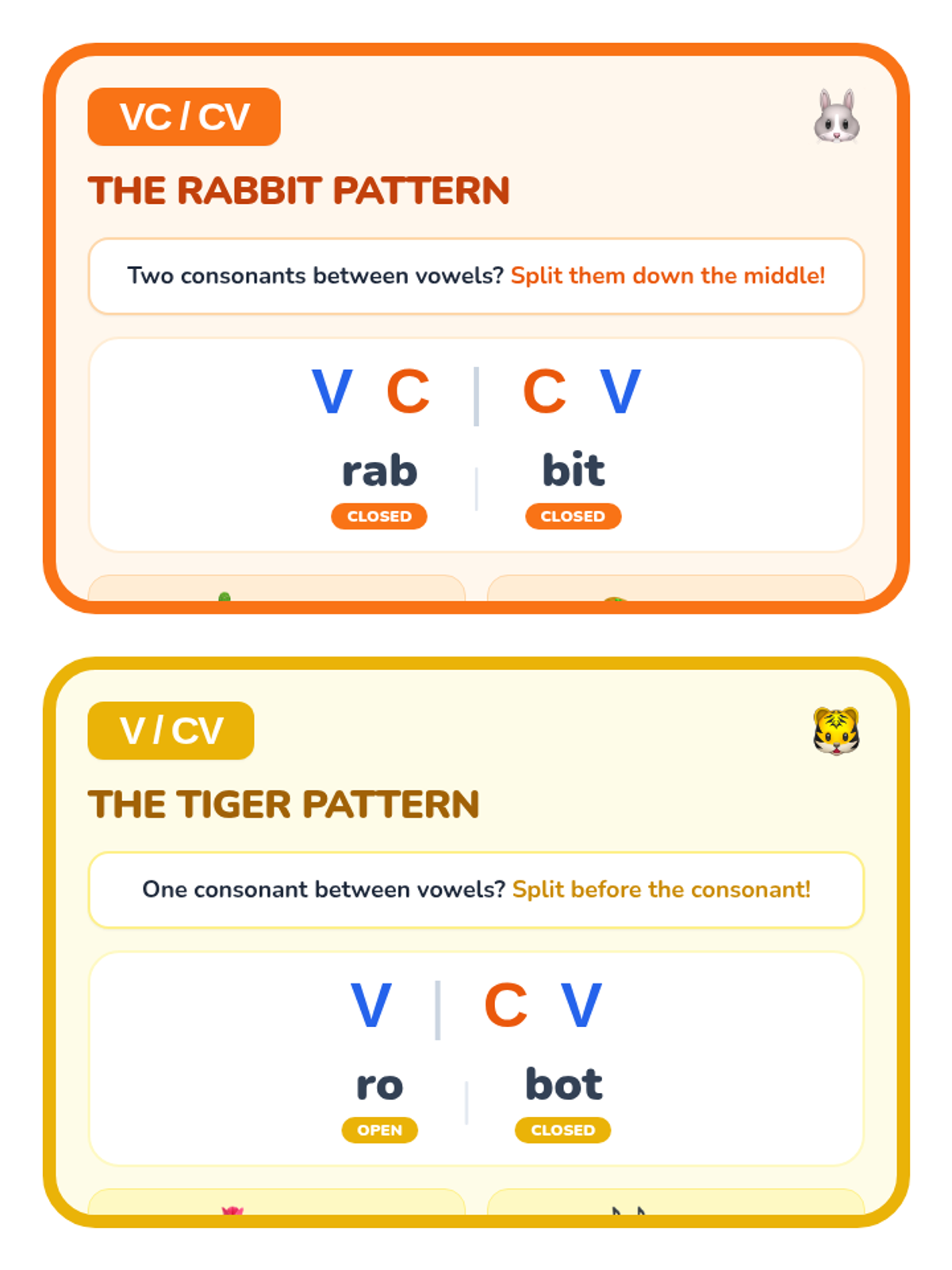 A set of four vibrant anchor charts for syllable division patterns (Rabbit, Tiger, Camel, and Lion), now formatted 2-per-page for space-efficient classroom use. Each chart features a clear rule statement, a visual syllable diagram, an example breakdown, and additional illustrated word examples.