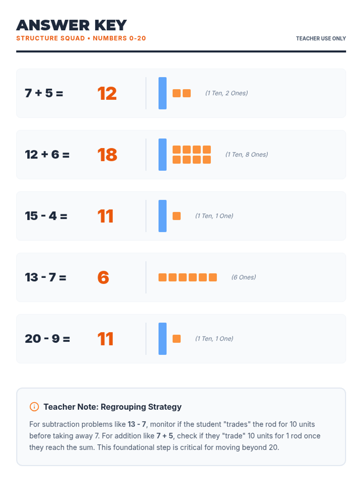 An engaging slide deck designed to teach 3rd-grade students how to add and subtract numbers within 20 using base ten blocks. Features clear visual models for representation, regrouping (composing tens), and trading (decomposing tens).