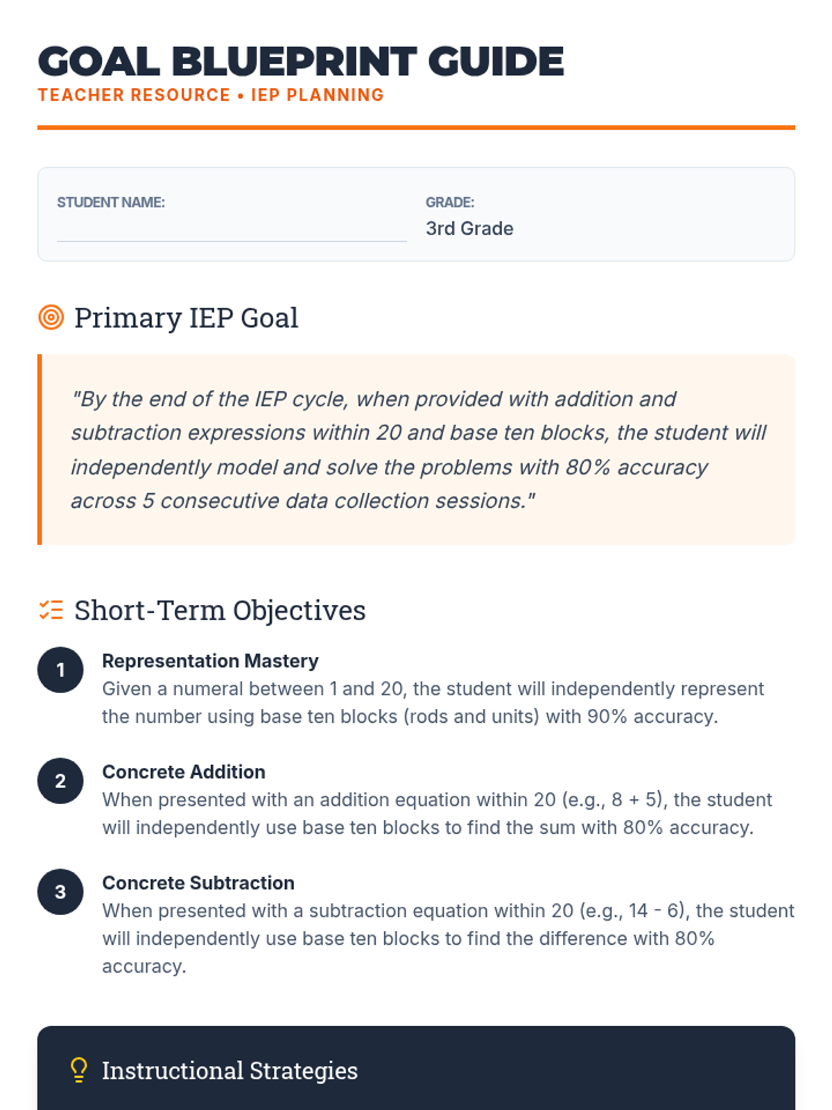 A comprehensive guide for teachers outlining the IEP goal and specific short-term objectives for a student learning addition and subtraction within 20 using base ten blocks. Includes instructional strategies and alignment with the CRA model.