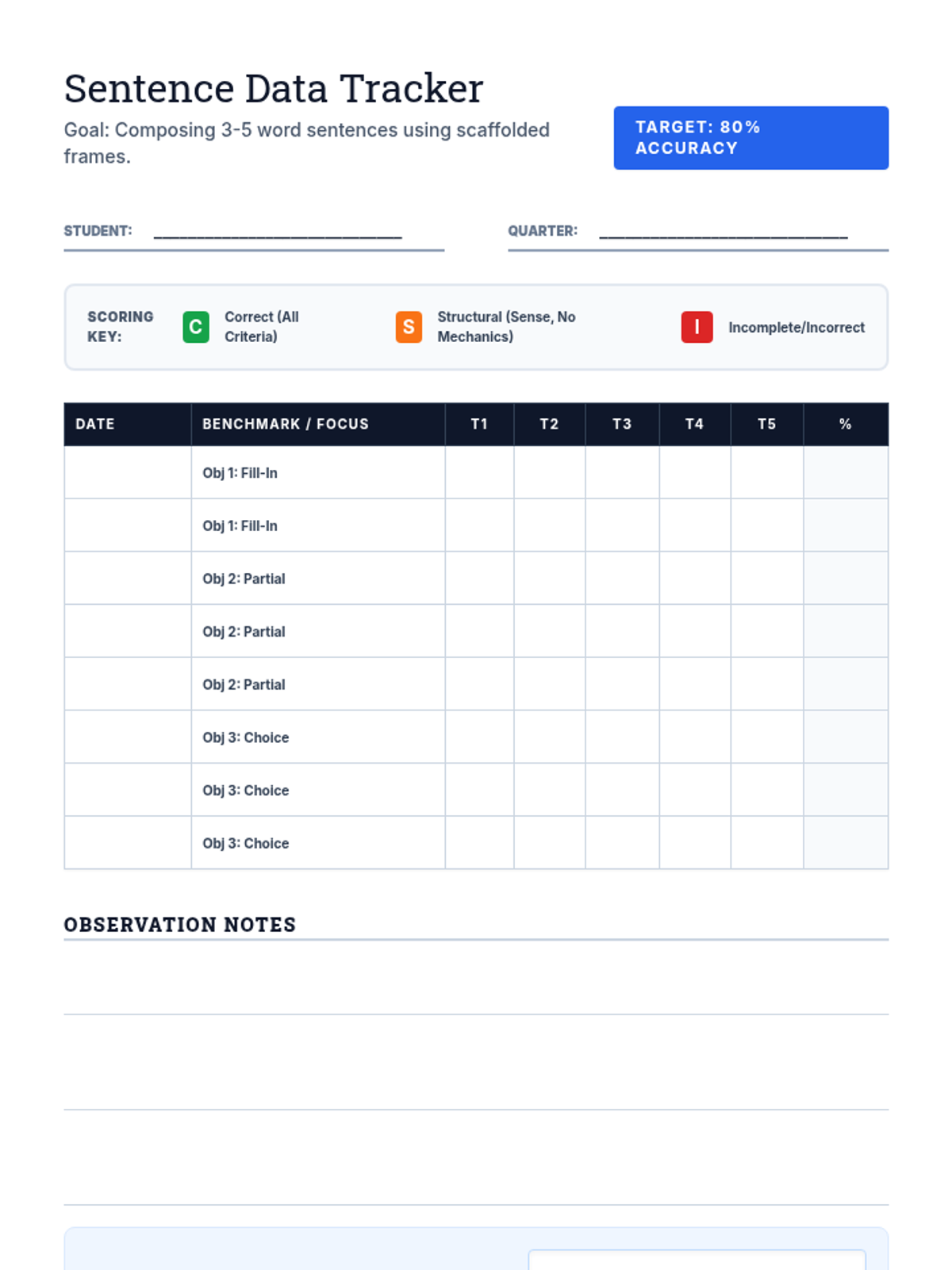 A data tracking tool for teachers to record progress on sentence construction trials, including scoring for structural correctness and mechanics. Fits on one page.