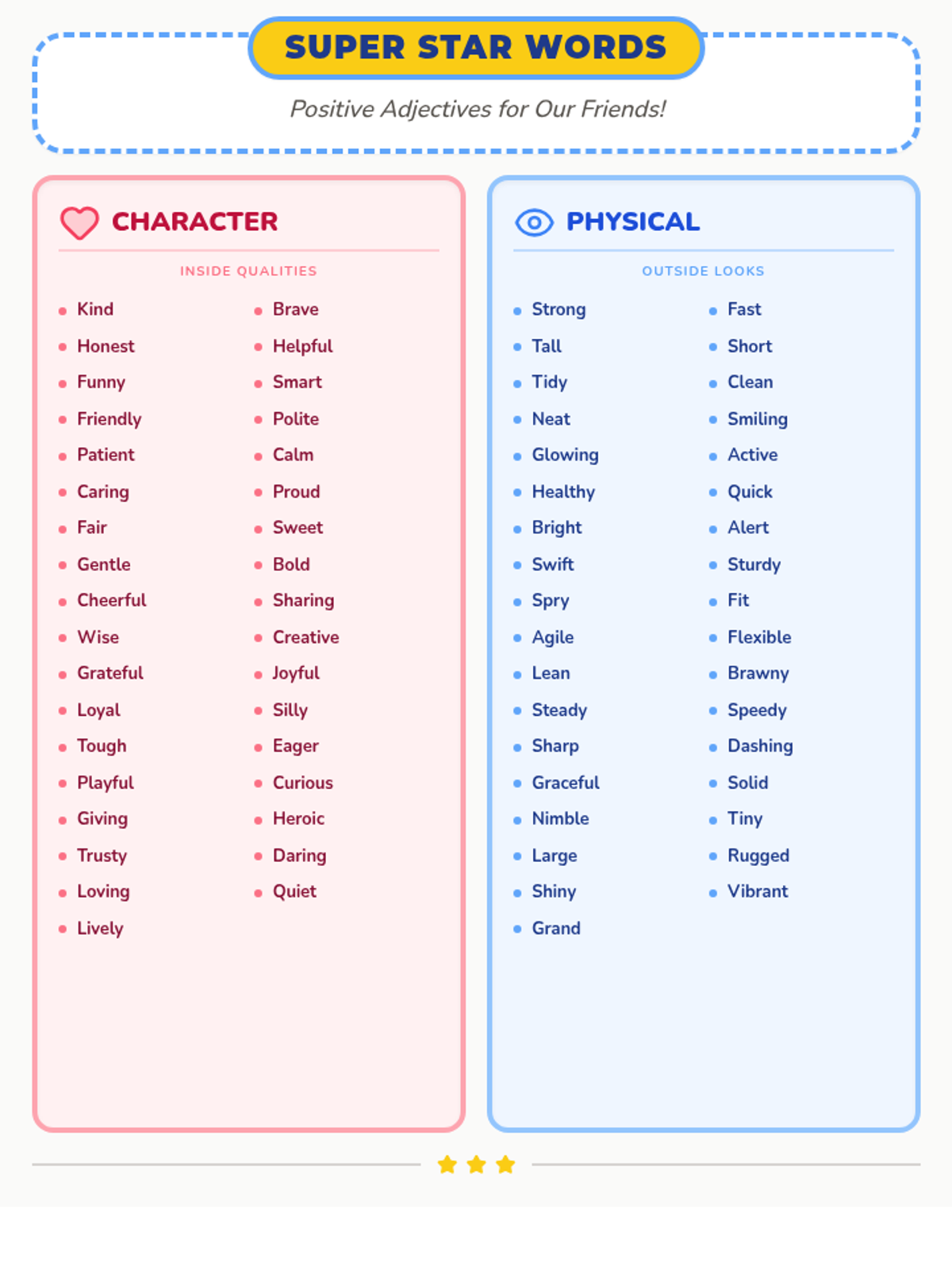 An updated, vibrant anchor chart poster for second graders featuring an expanded list of 35 positive character traits and 35 physical adjectives. The layout uses a clear two-column grid within each section to maintain legibility while maximizing vocabulary.