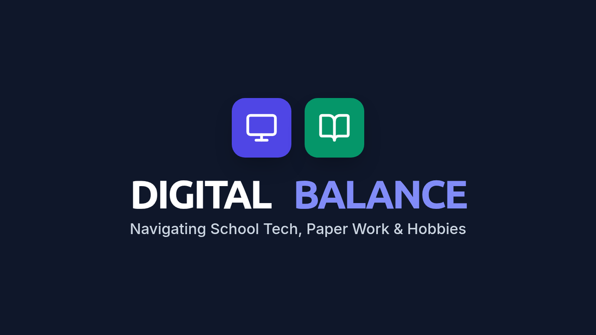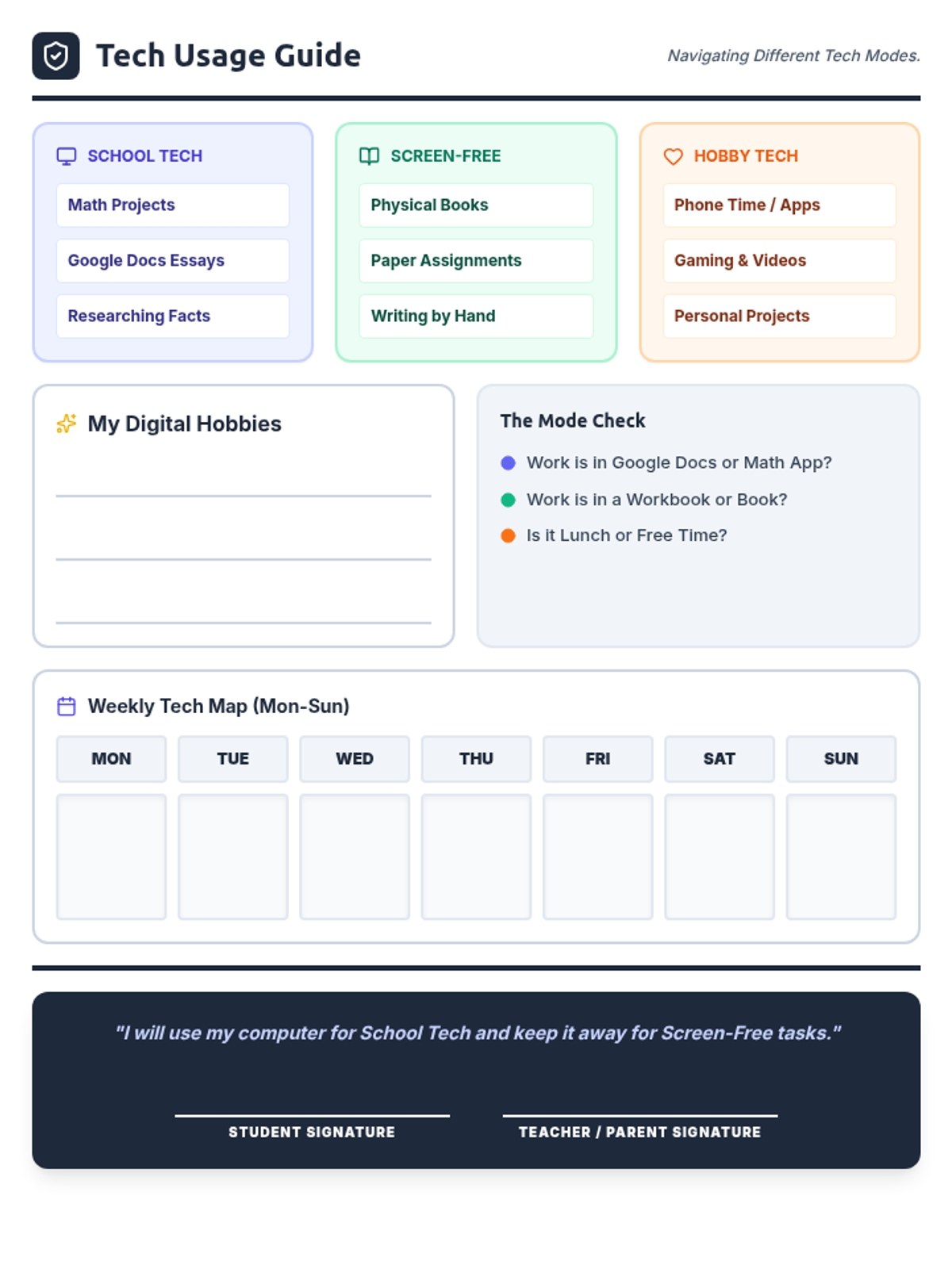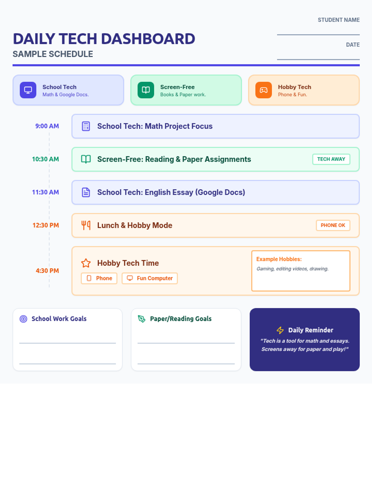 A teacher and student resource that clearly defines the boundaries of digital tech (Math, Essays), screen-free paper time, and personal hobbies.